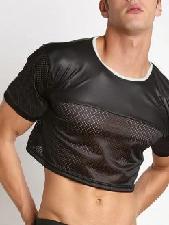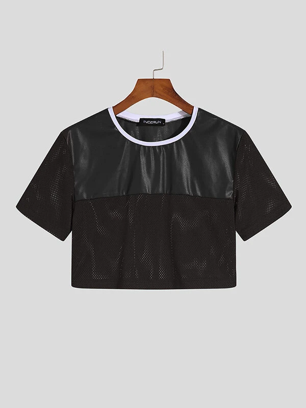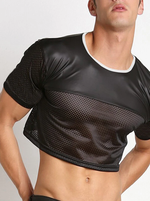 Men Mesh Patchwork Artificial Leather Short Crop Top