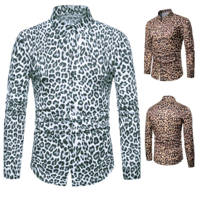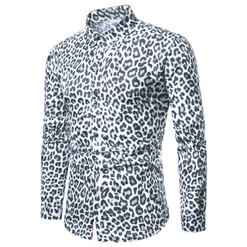 Men’s Casual Leopard Printed Turn Down Collar Slim Fit Long Sleeve Shirt