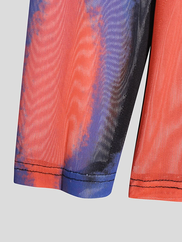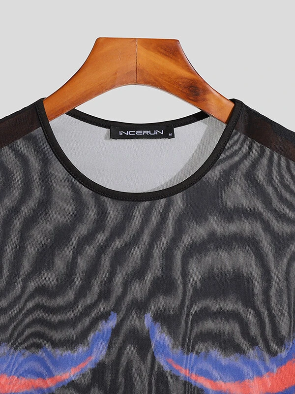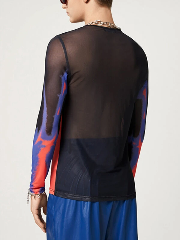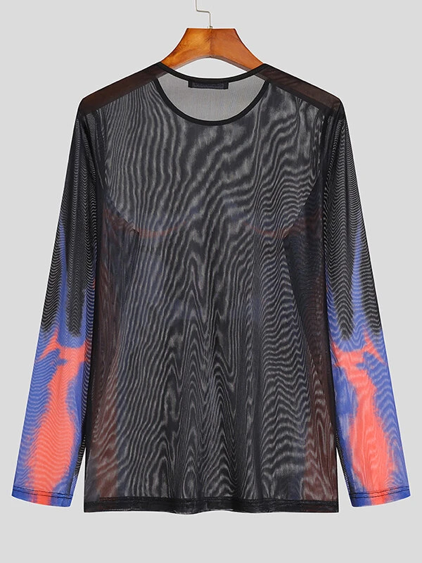 Mens Abstract Print See Through Mesh Long Sleeve T-Shirt