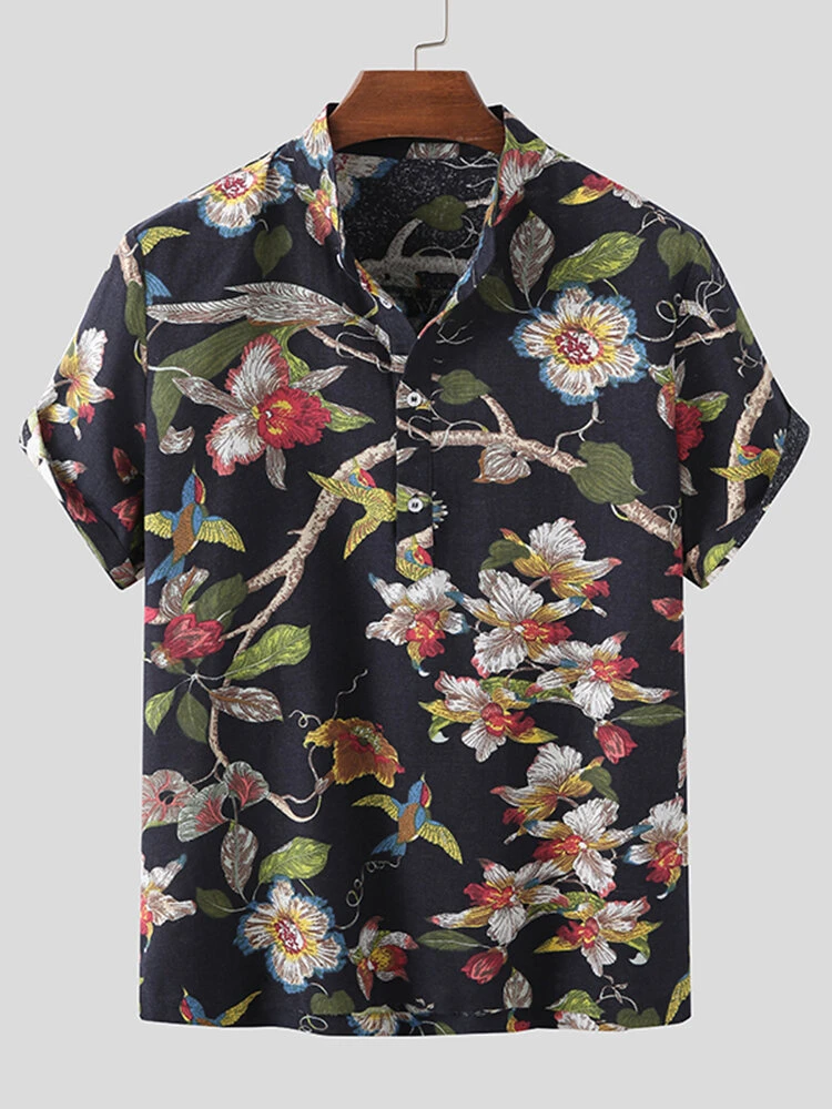 Occasion: Casual Color: Navy Size: S, M, L, XL, 2XL, 3XL, 4XL, 5XL Pattern: Floral Print Collar: Stand Collar Material: Cotton Sleeves Length: Short Sleeve Thickness: Moderate Season: Summer Design Element: Print, Button Fit Type: Regular Package included:1*Henley ShirtPlease Note:Please see the Size Reference to find the correct size.