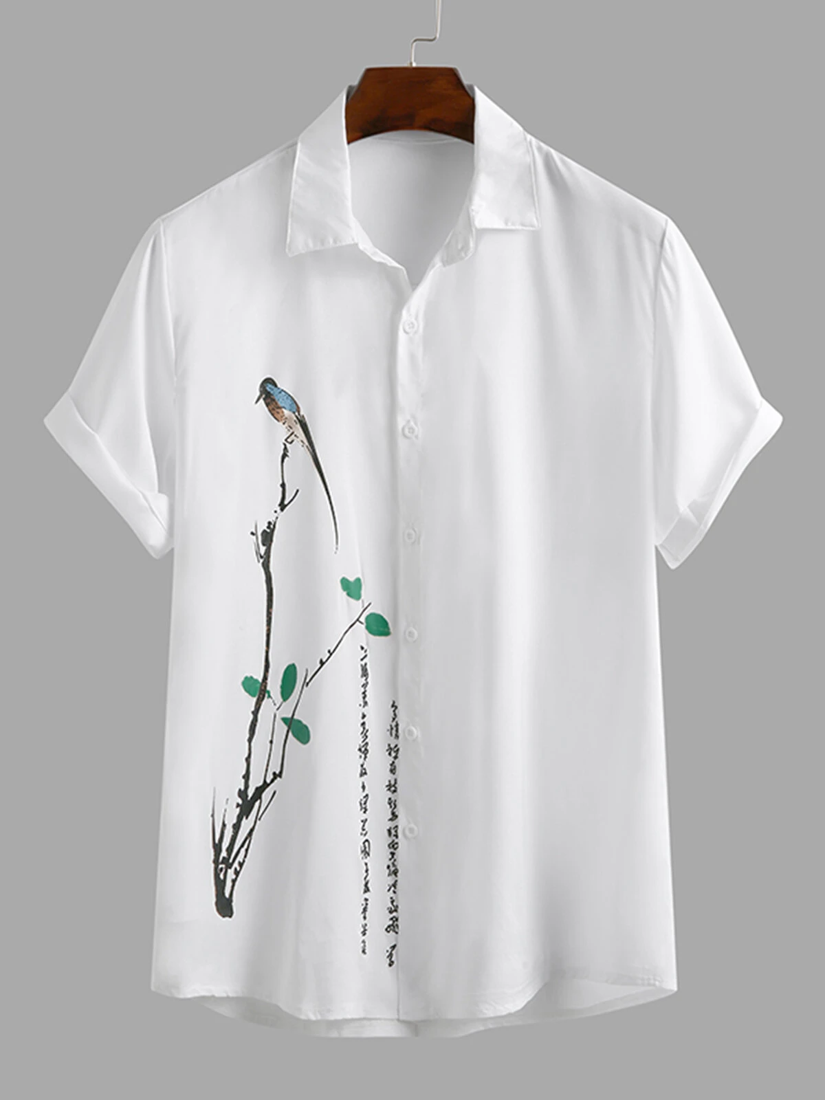 Mens Bird Tree Print Short Sleeve Lapel Shirt