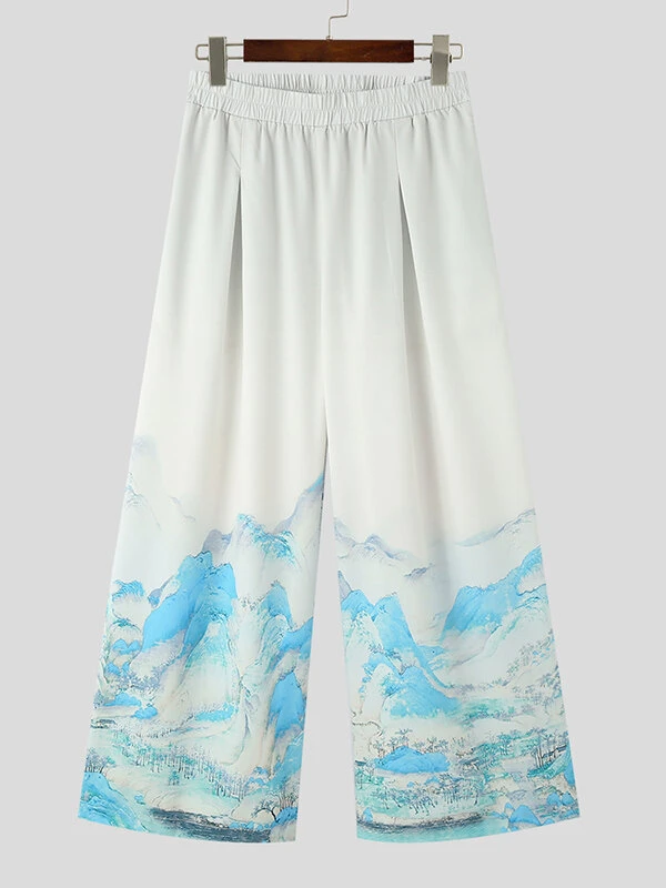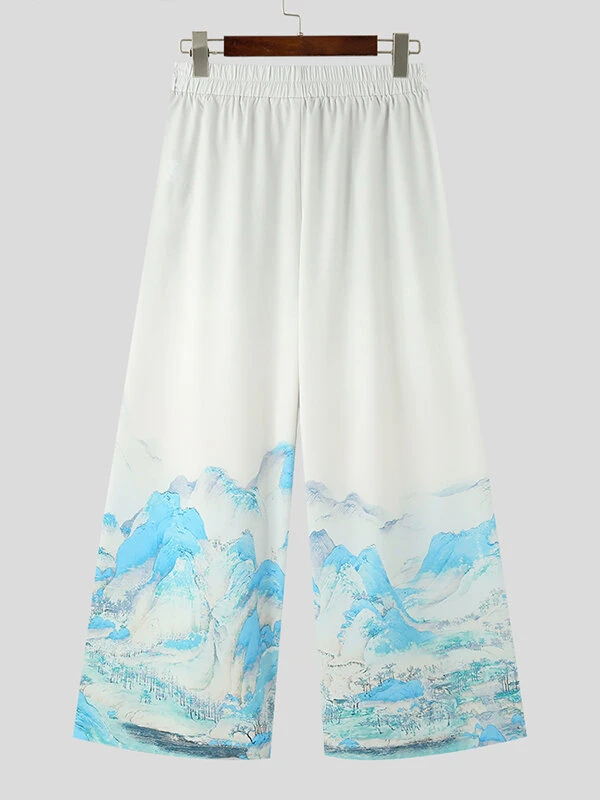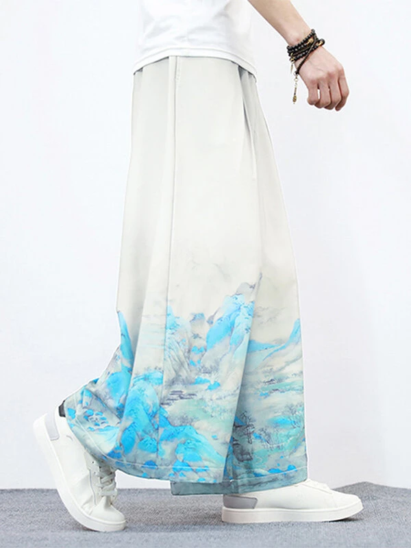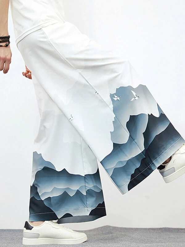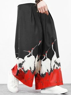 Mens Chinese Style Crane Landscape Print Wide Leg Pants