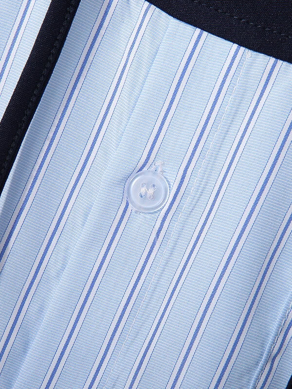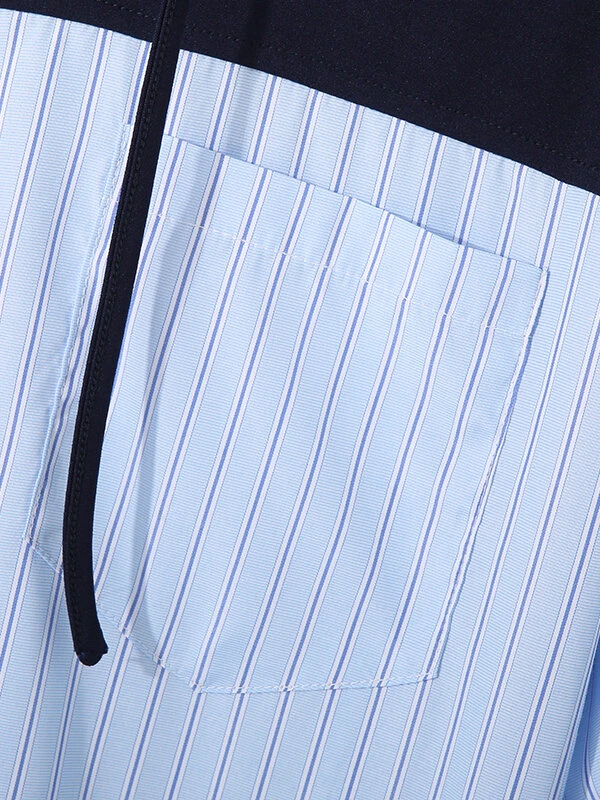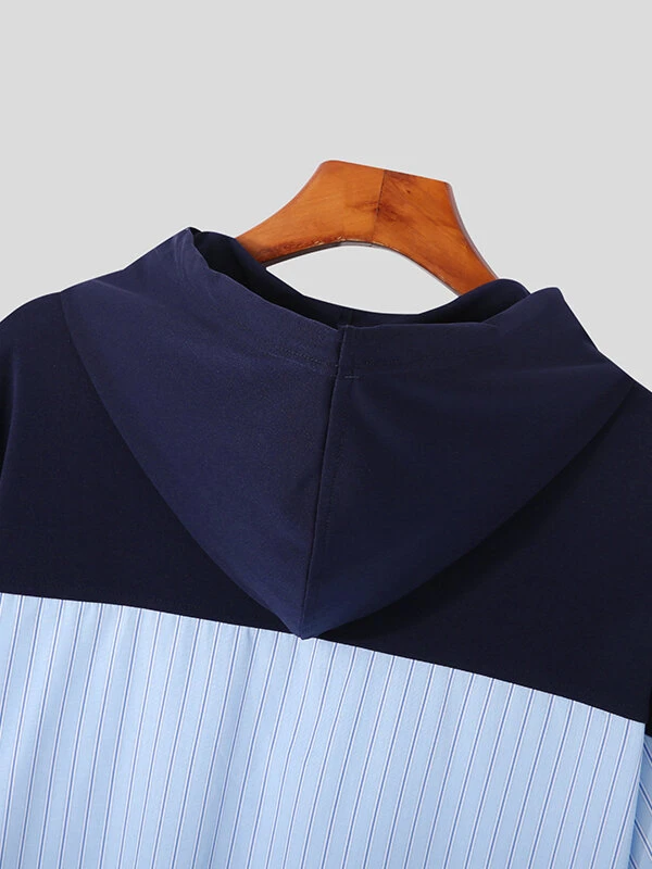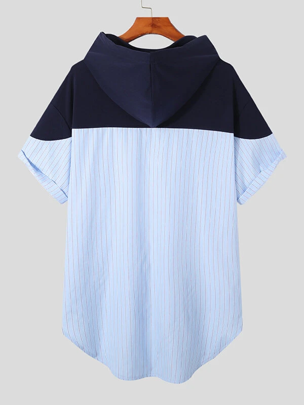 Occasion: Casual Color: Blue Size: S, M, L, XL, 2XL, 3XL, 4XL, 5XL Pattern: Striped Collar: Hooded Material: Polyester Sleeves Length: Short Sleeve Thickness: Moderate Season: Summer Design Element: Drawstring, Pocket, Button, Patchwork Package Included:1*Shirt