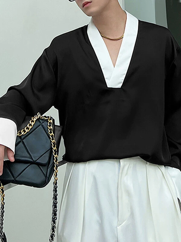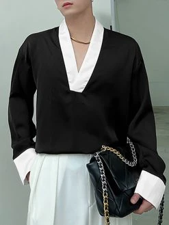 Occasion: Casual Color: Black, White Size: S, M, L, XL, 2XL, 3XL, 4XL, 5XL Collar: V-neck Material: Polyester Sleeves Length: Long Sleeve Thickness: Moderate Season: Autumn, Spring Design Element: Patchwork Package Included:1*T-shirt