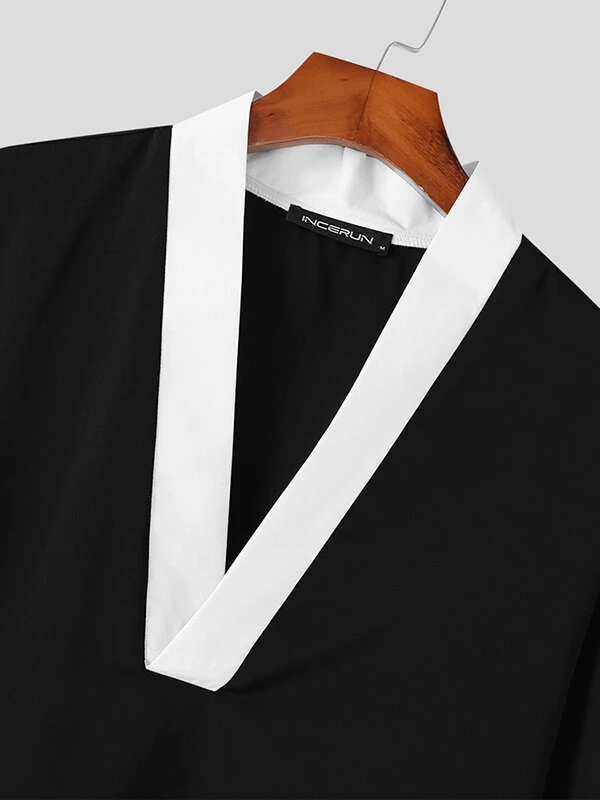Mens Contrast Patchwork Long Sleeve V-neck T-shirt