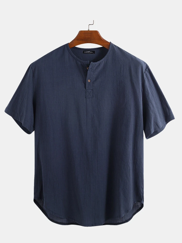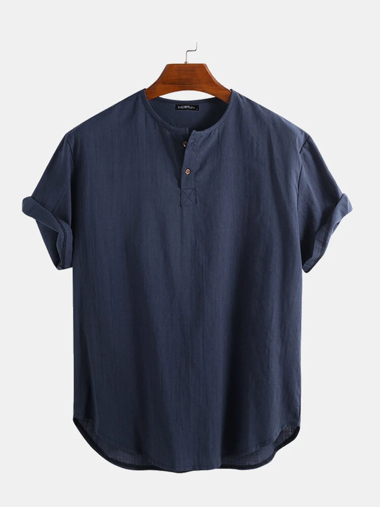 Occasion: Casual, Everyday Color: Navy, White Size: S, M, L, XL, 2XL, 3XL, 4XL, 5XL Pattern: Solid Material: Cotton Sleeves Length: Short Sleeve Thickness: Thin Season: Spring, Summer Design Element: Button Fit Type: Loose Package Include: 1* Henley Shirt Please Note: Please see the Size Reference to find the correct size.