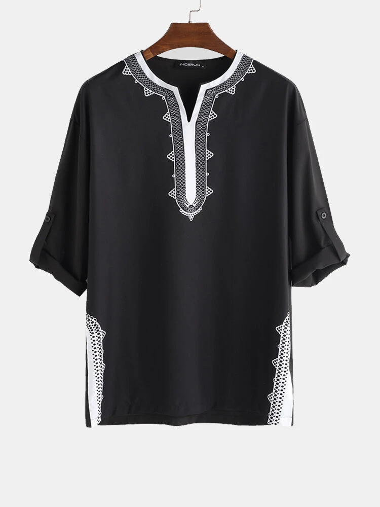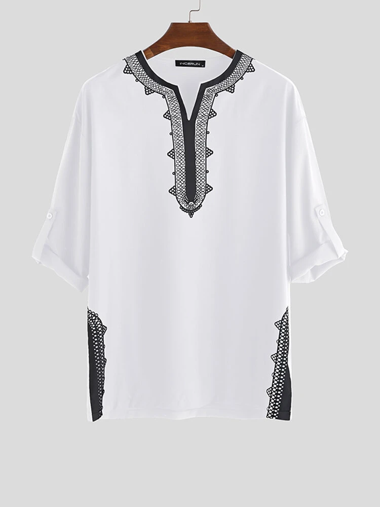Mens Ethnic Style Stitching Print Cropped Half Sleeve Shirts
