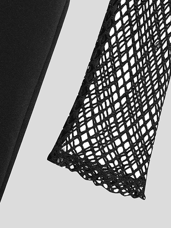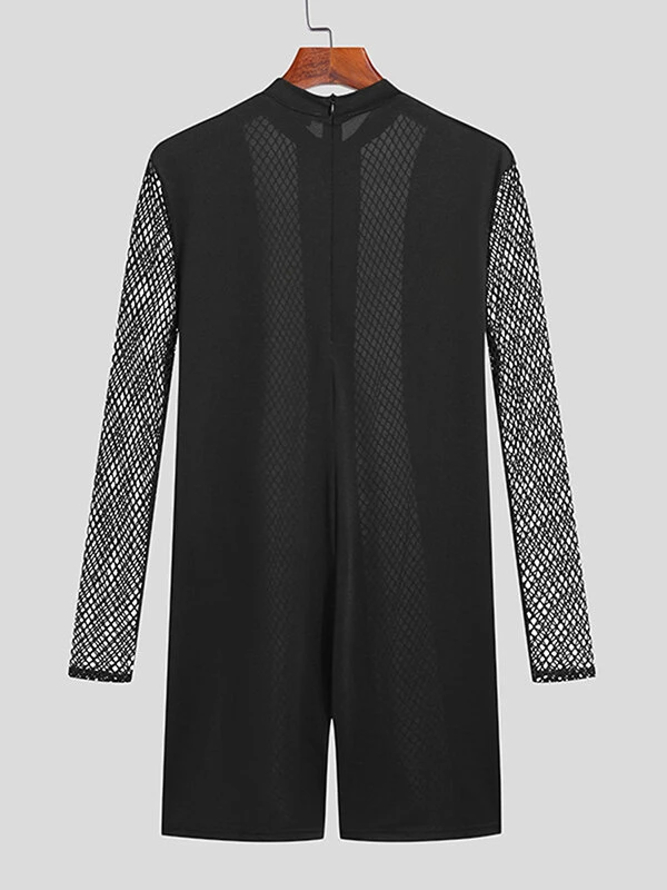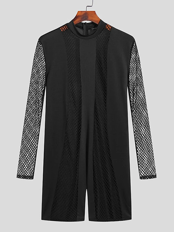 Mens Fishnet Patchwork Crew Neck Long Sleeve Bodysuit