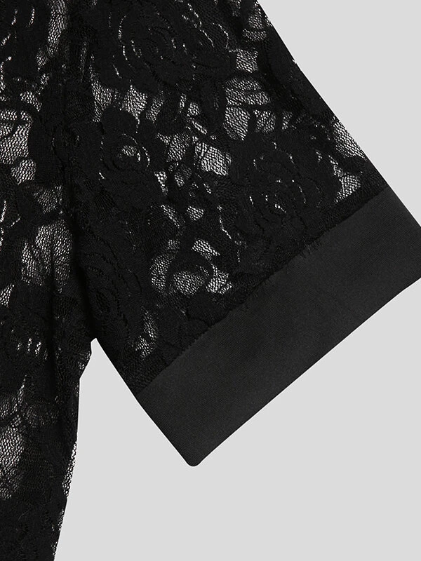 Mens Floral Lace See Through High Neck Short Sleeve T-Shirt