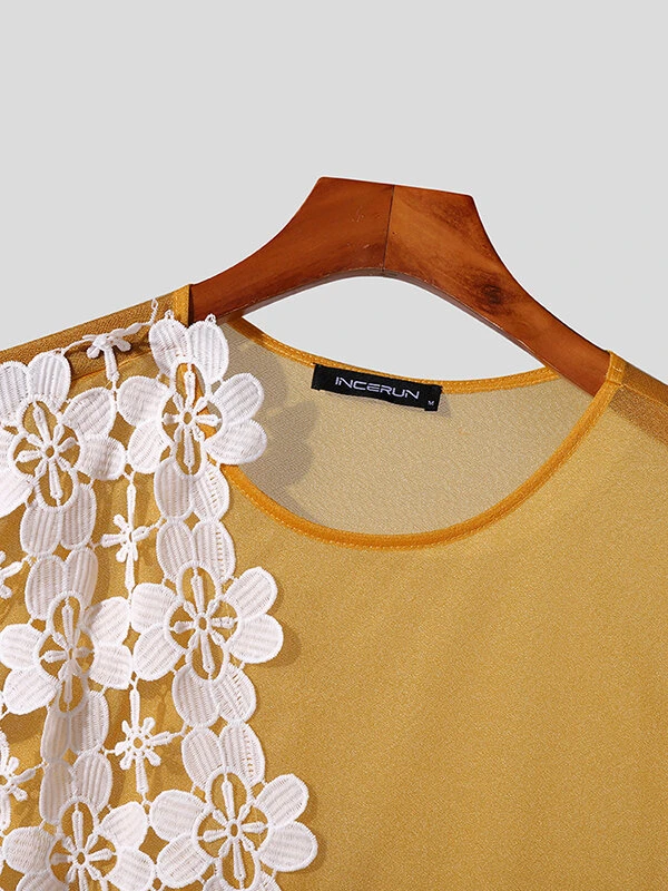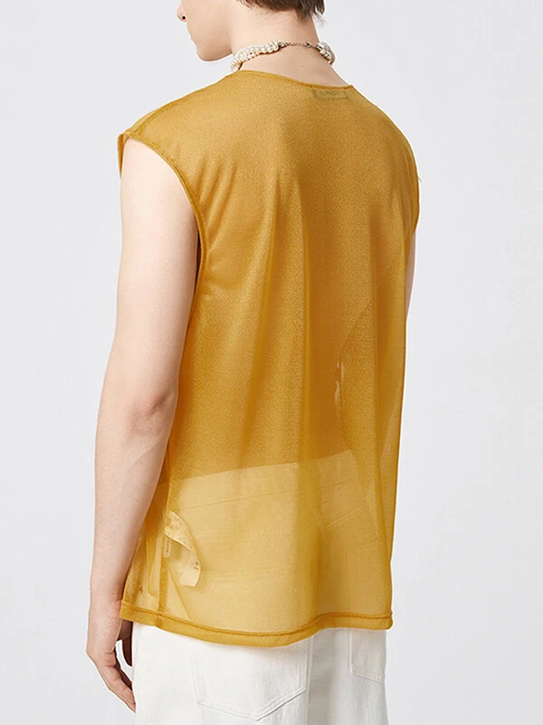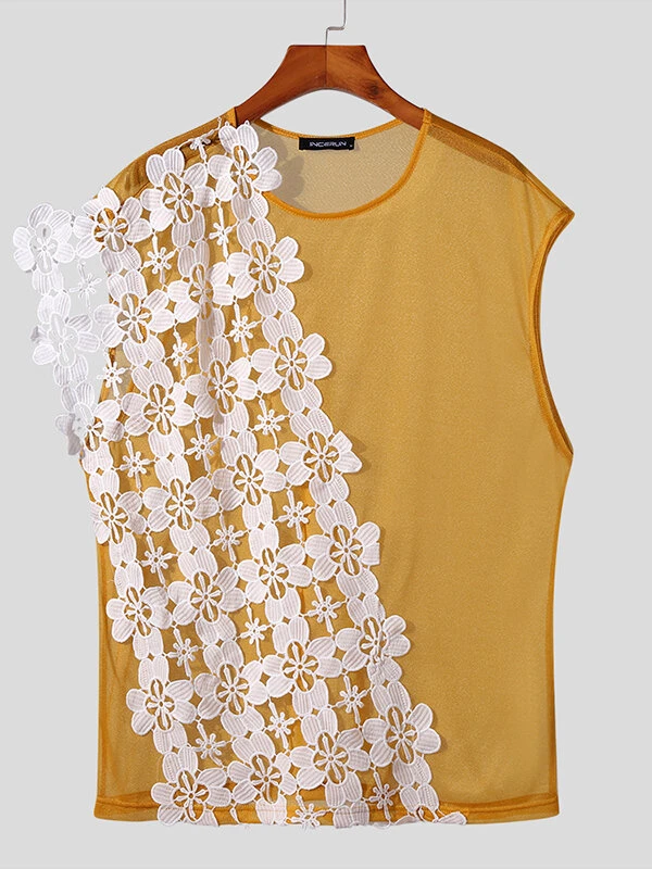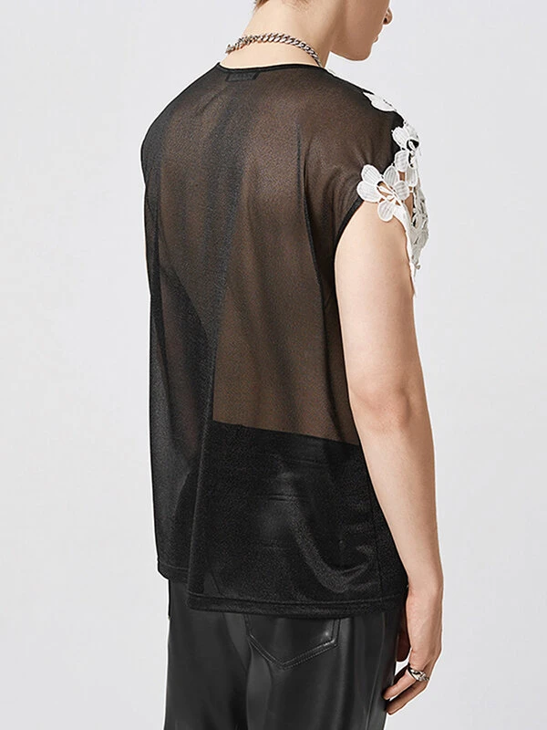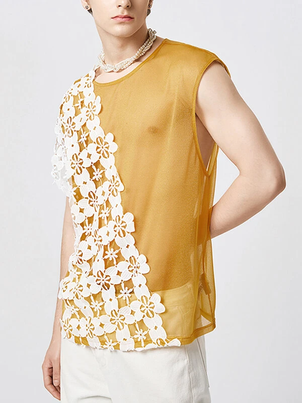 Mens Floral Lace Splice Mesh See Through Sleeveless Tank