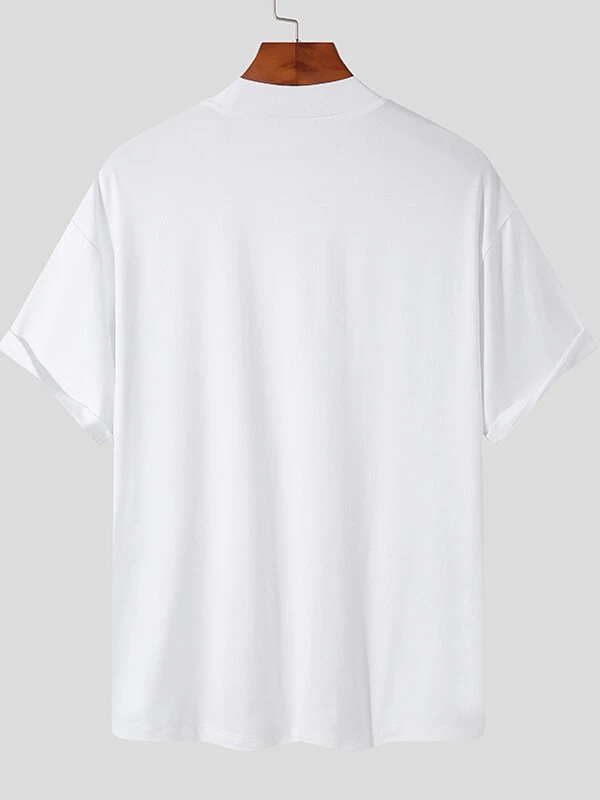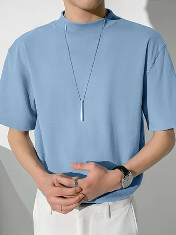 Mens High Neck Solid Color Short Sleeve T-shirt