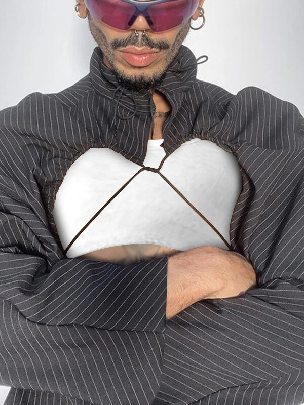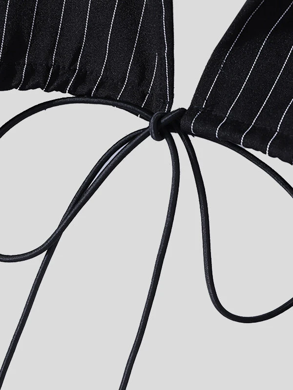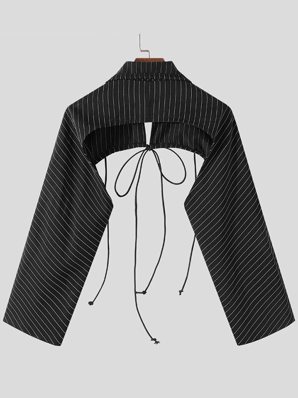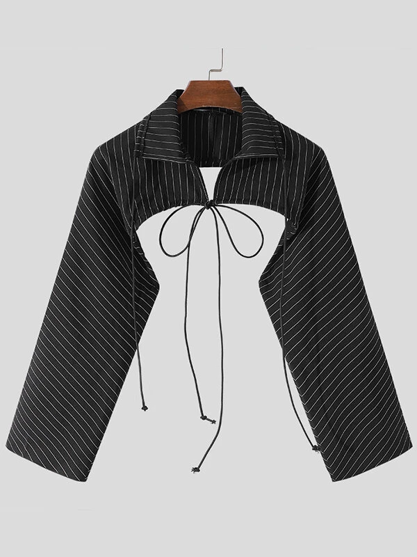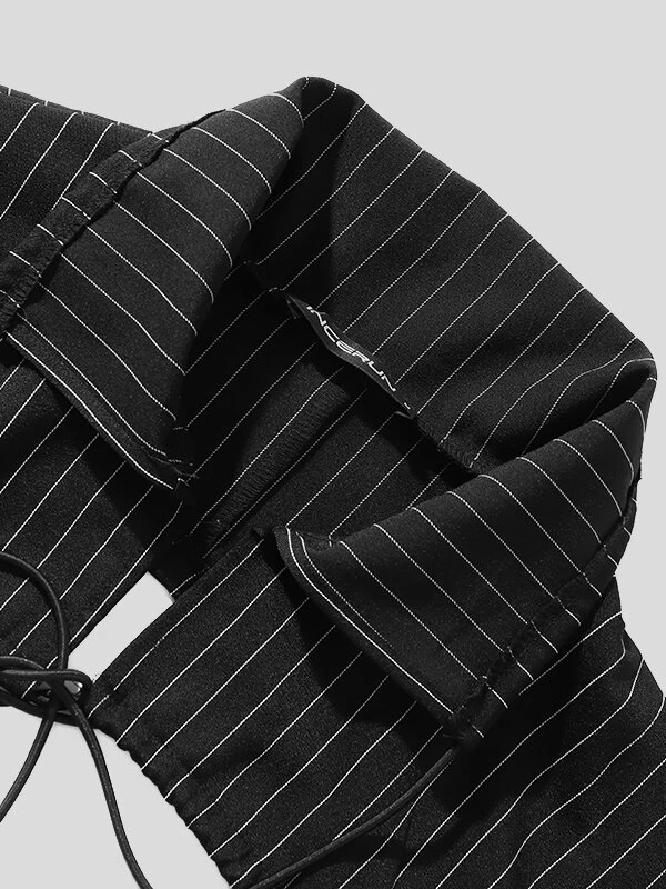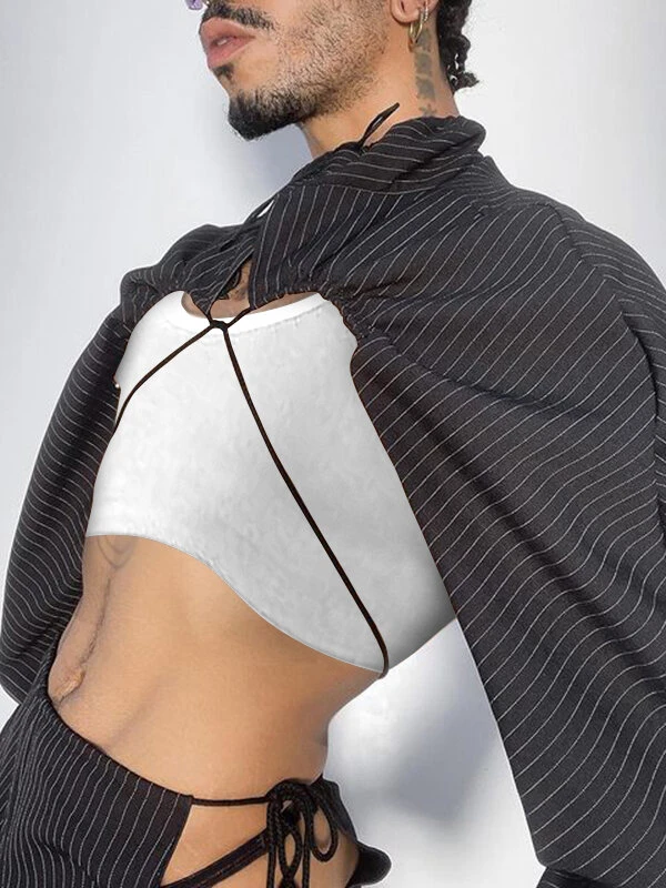 Mens Hollow Striped Drawstring Lapel Crop Tops