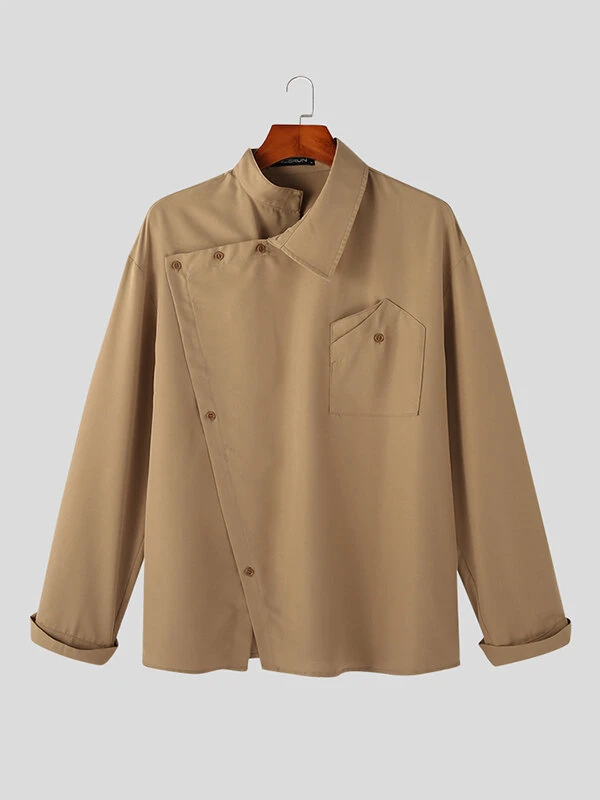Mens Irregular Oblique Button Design Solid Long Sleeve Shirt