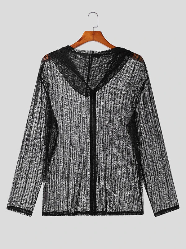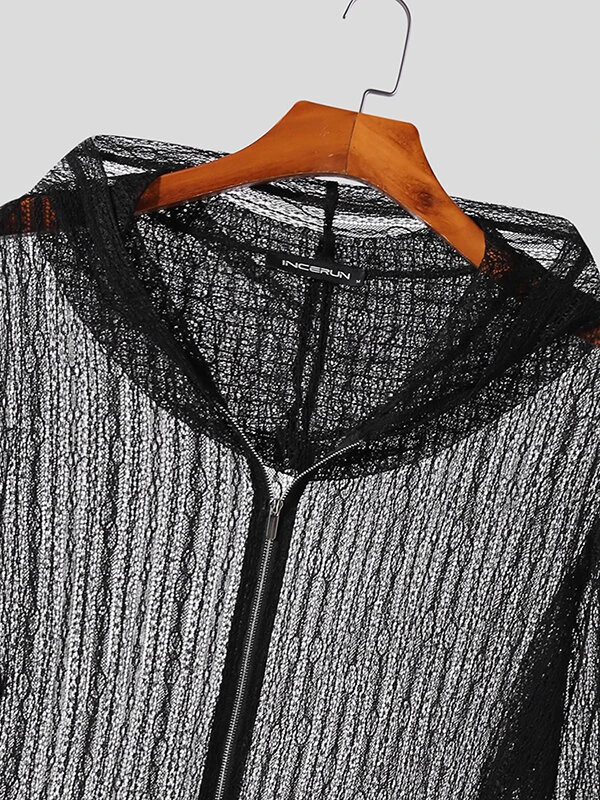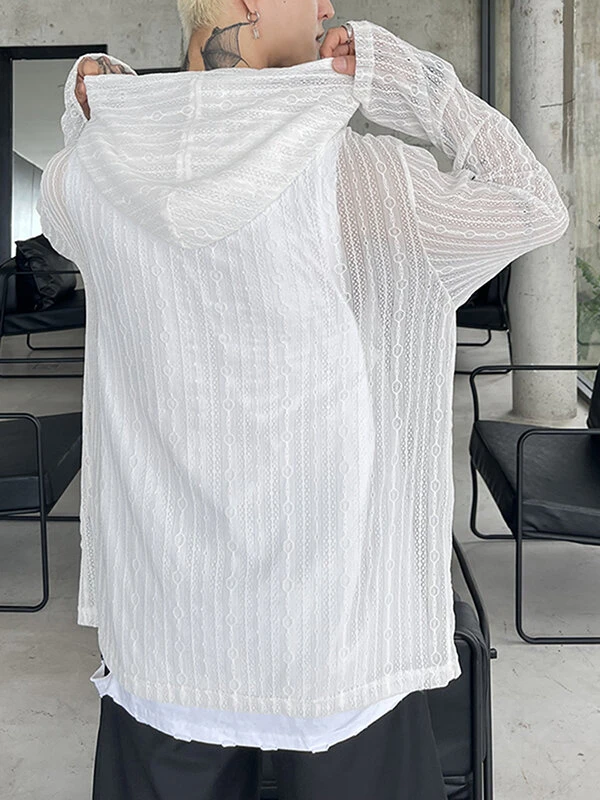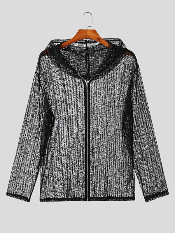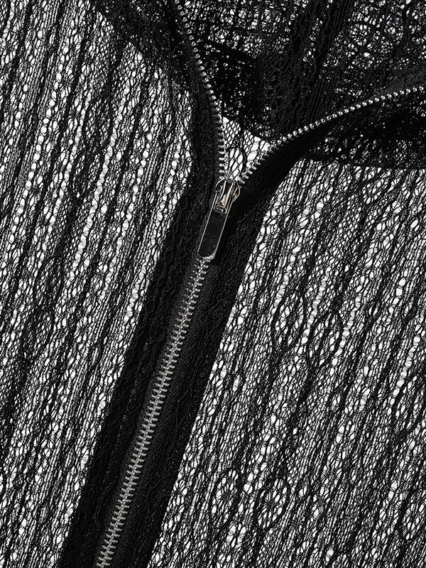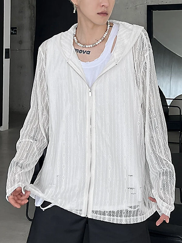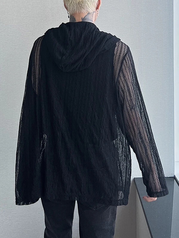 Mens Lace Hollow Out Zip Front Hooded Jacket
