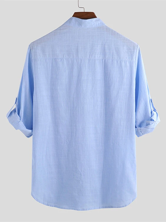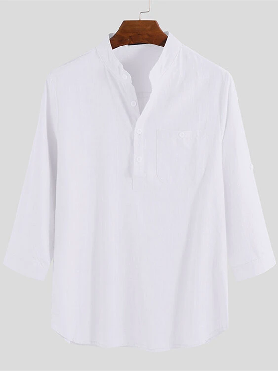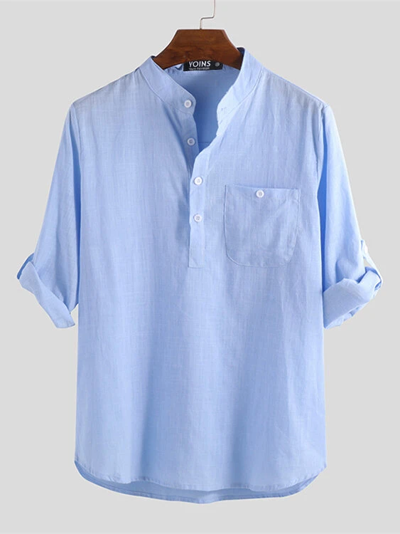 Mens Linen Casual Roll Sleeve Loose Buttons Pullover Henley Shirts