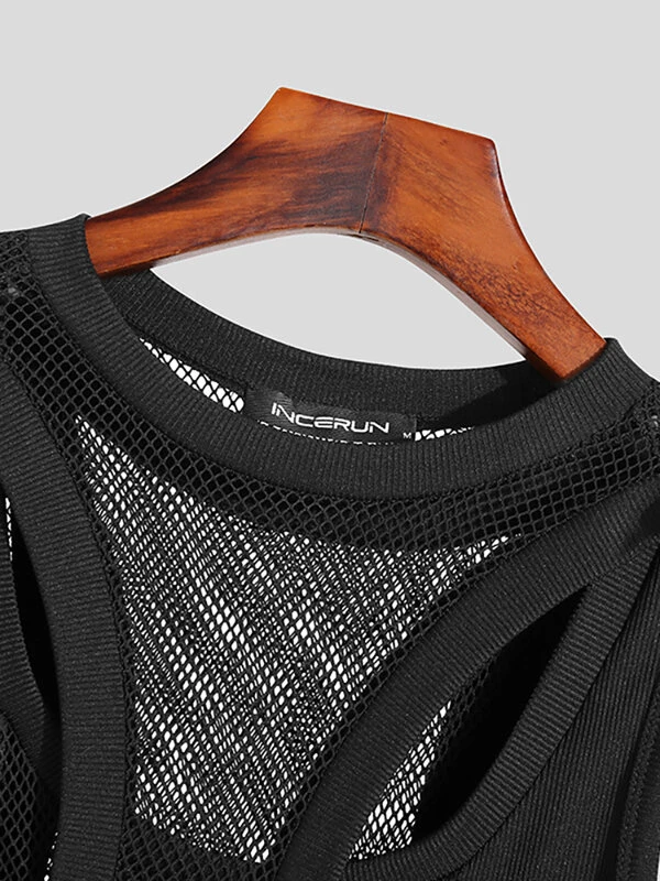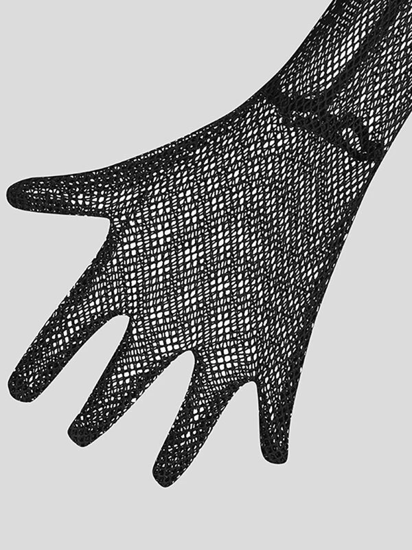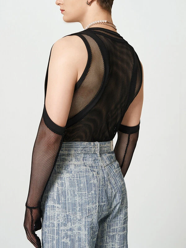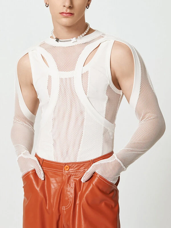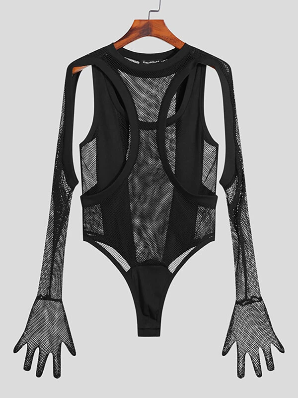 Mens Mesh Cutout Long Sleeve Gloves Bodysuit
