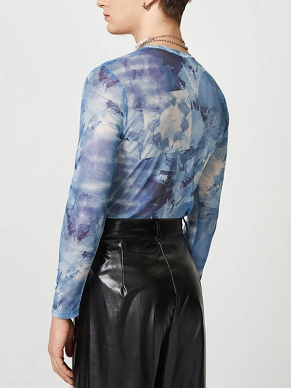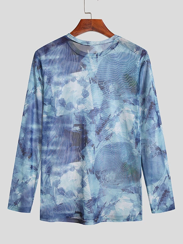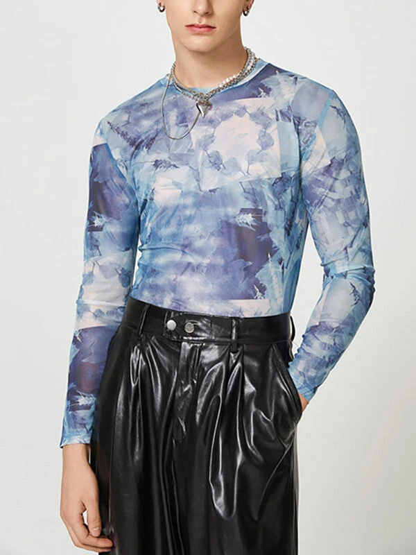Mens Mesh Print Crew Neck Long Sleeve T-Shirt