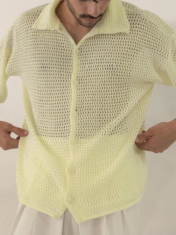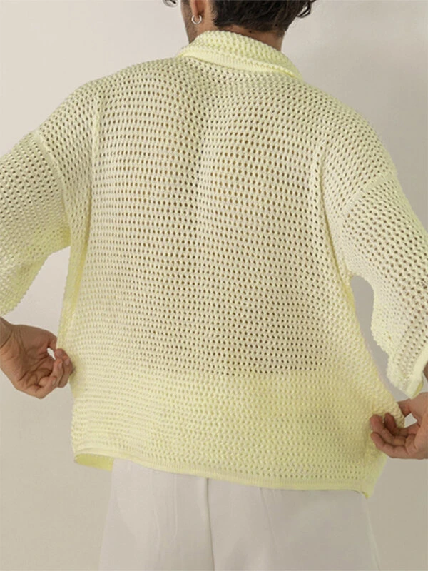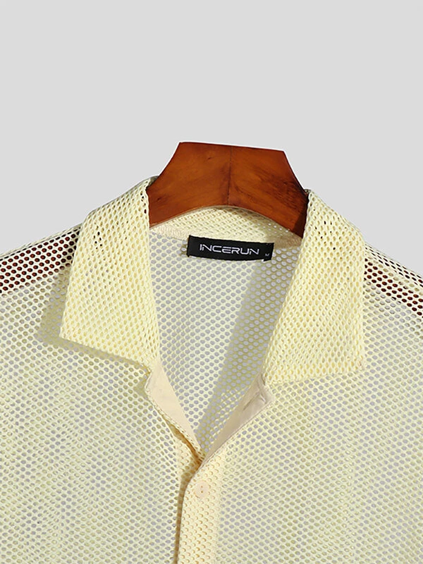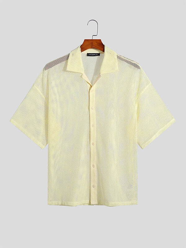 Mens Mesh See Through Lapel Short Sleeve Loose Shirt