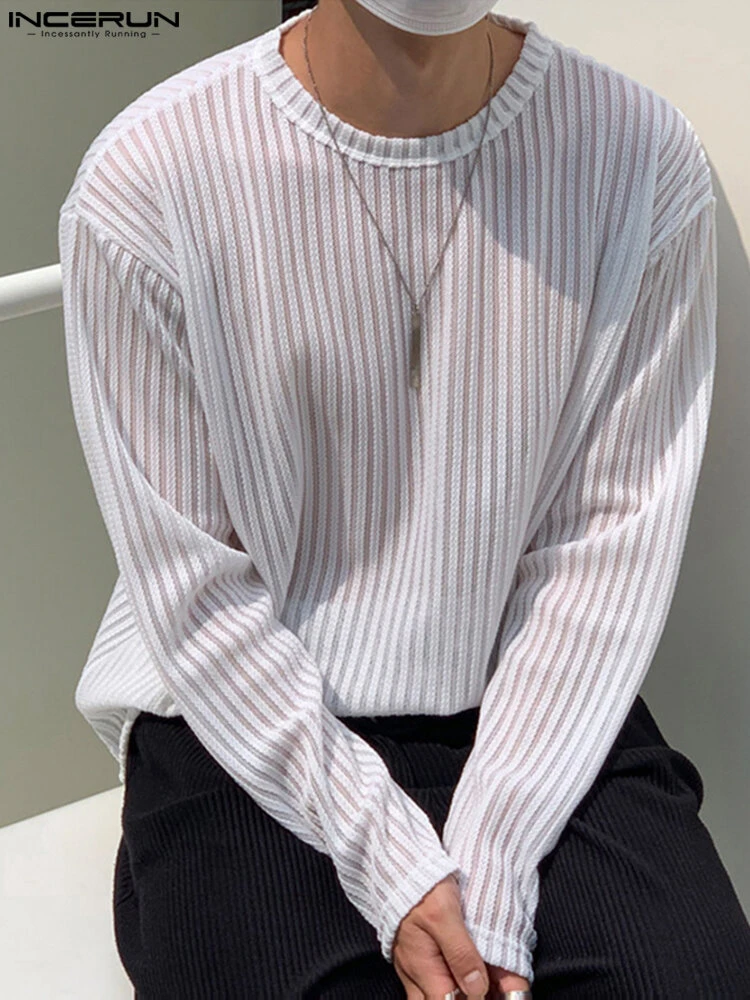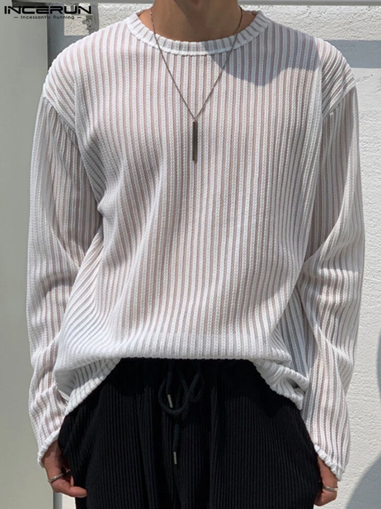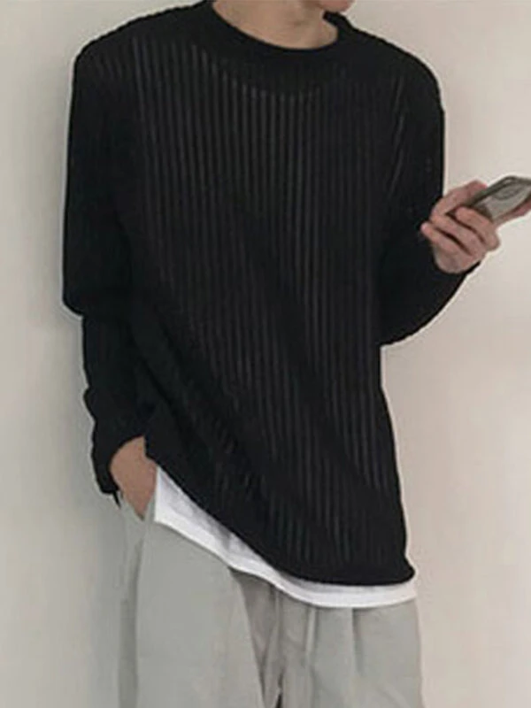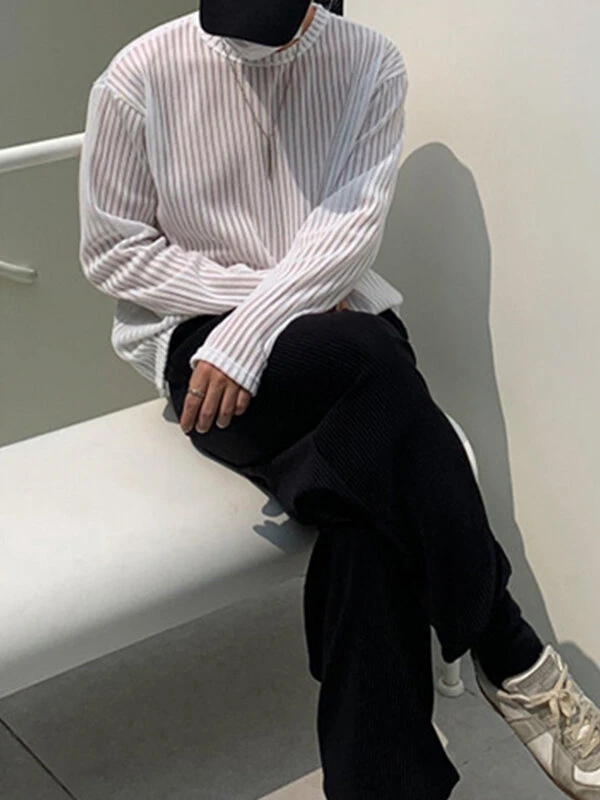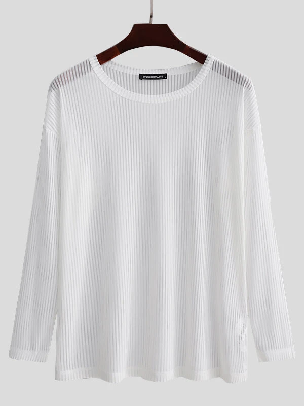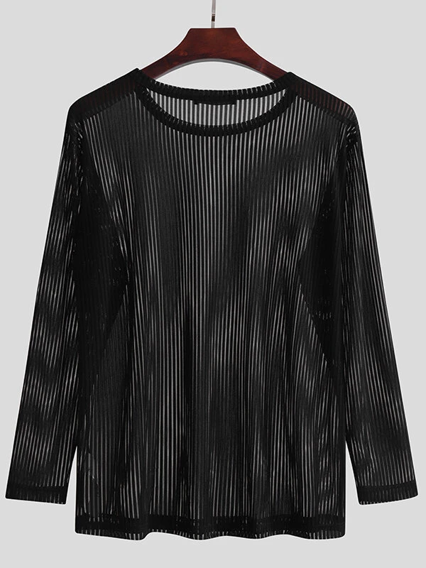 Mens Pleated Mesh Striped Long Sleeve T-Shirts