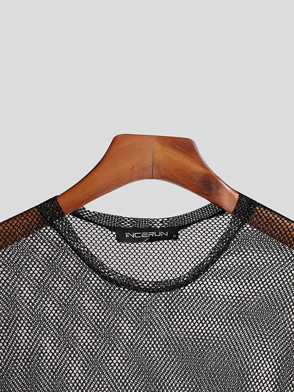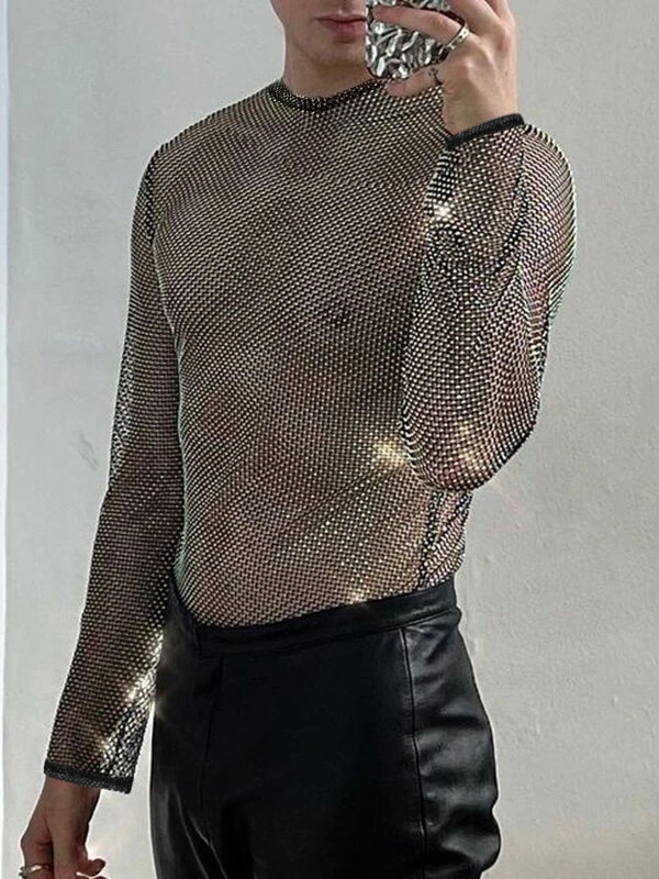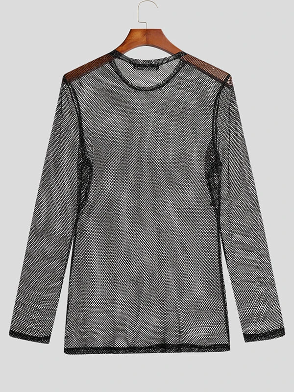 Mens Shiny Mesh See-Through Long Sleeve T-Shirt