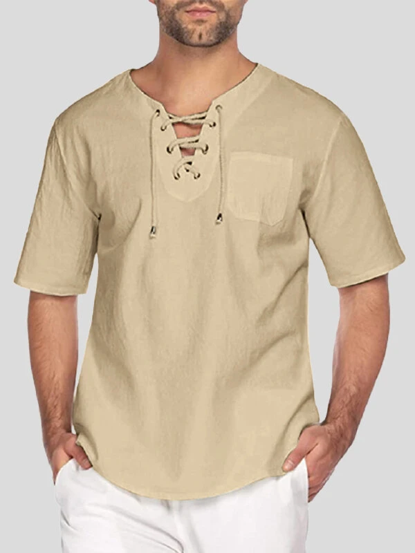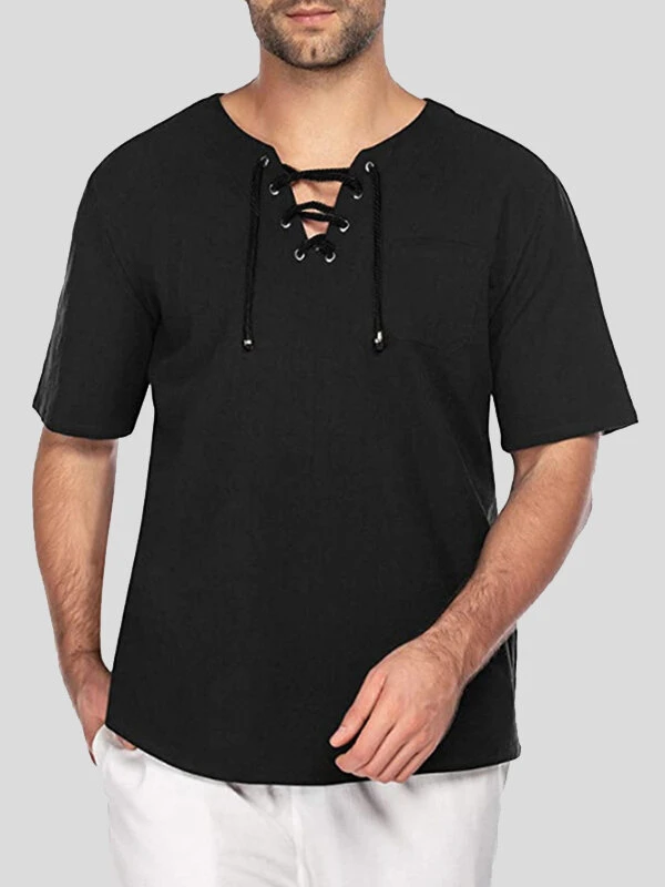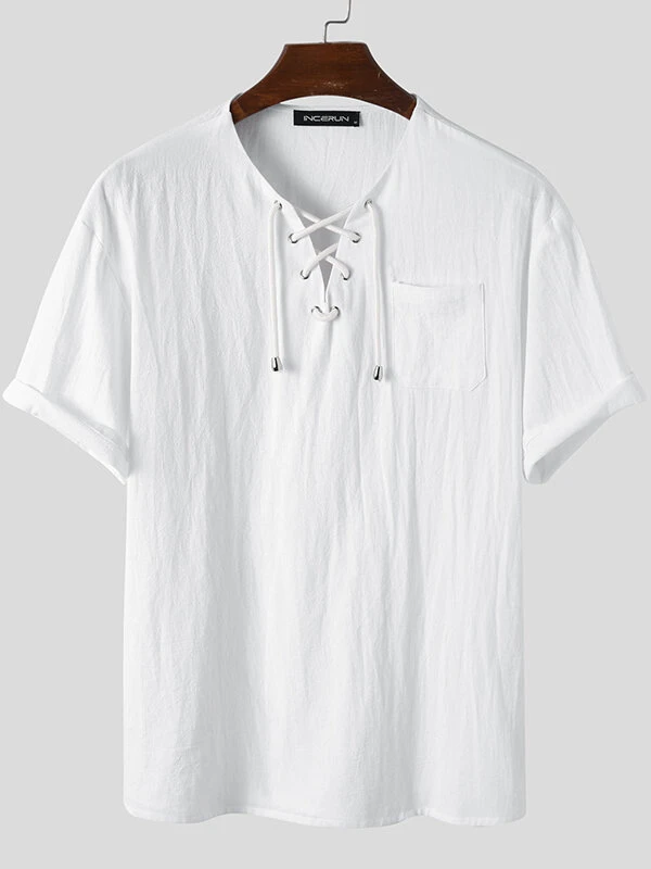 Mens Solid Drawstring V-Neck Cotton Short Sleeve T-Shirt