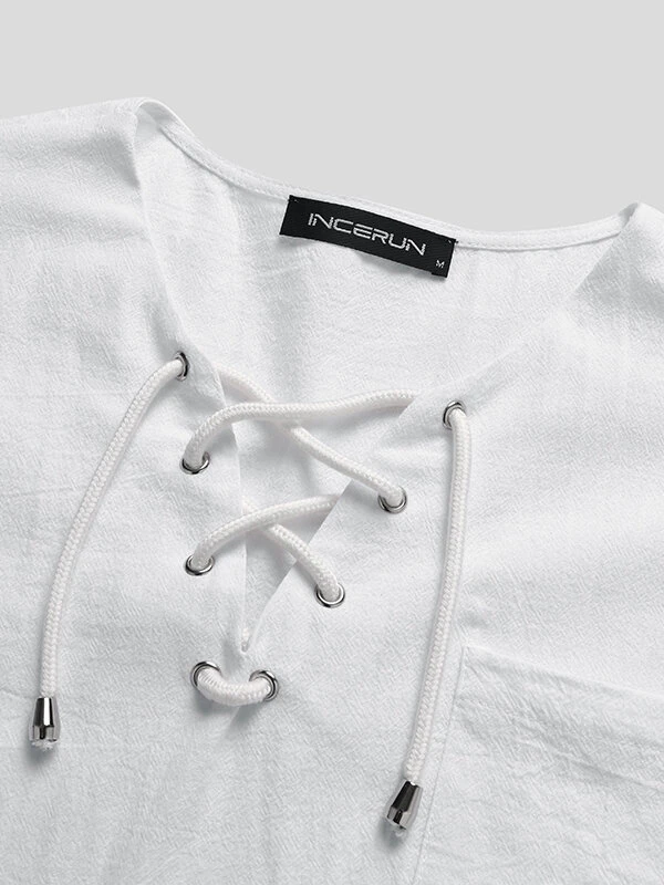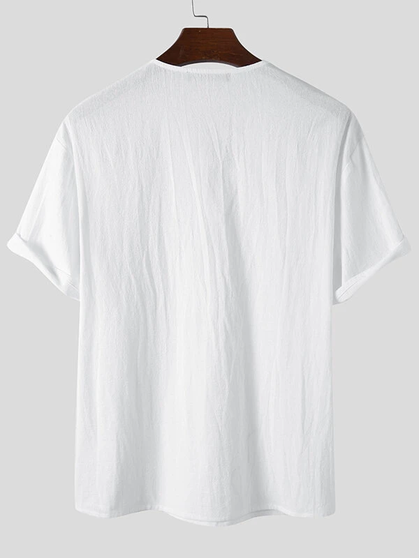 Occasion: Casual Color: Black, White, Khaki Size: S, M, L, XL, 2XL, 3XL, 4XL, 5XL Pattern: Solid Collar: V-neck Material: Cotton Sleeves Length: Short Sleeve Thickness: Moderate Season: Summer Design Element: Drawstring Fit Type: Loose Package included:1*T-ShirtPlease Note:Please see the Size Reference to find the correct size.