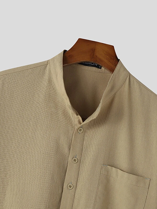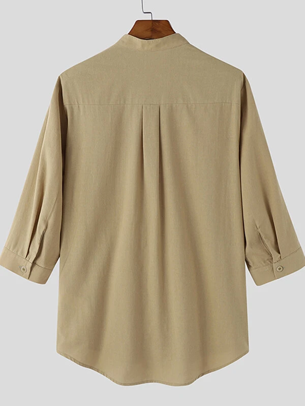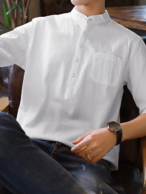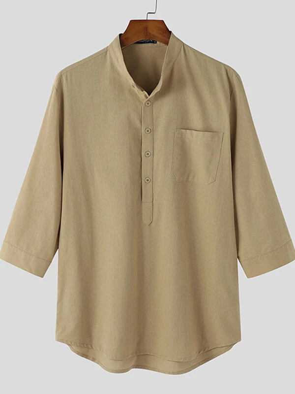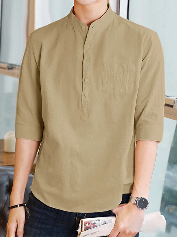 Color: Gray, Khaki, White, Black Occasion: Daily Size: S, M, L, XL, 2XL, 3XL, 4XL, 5XL Pattern: Solid Collar: Stand Collar Material: Cotton Sleeves Length: 3/4 Length Sleeve Thickness: Moderate Season: Summer Design Element: Button, Pocket Fit Type: Regular Package included:1*Henley ShirtPlease Note:Please see the Size Reference to find the correct size.