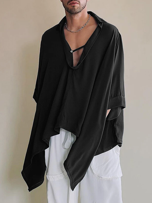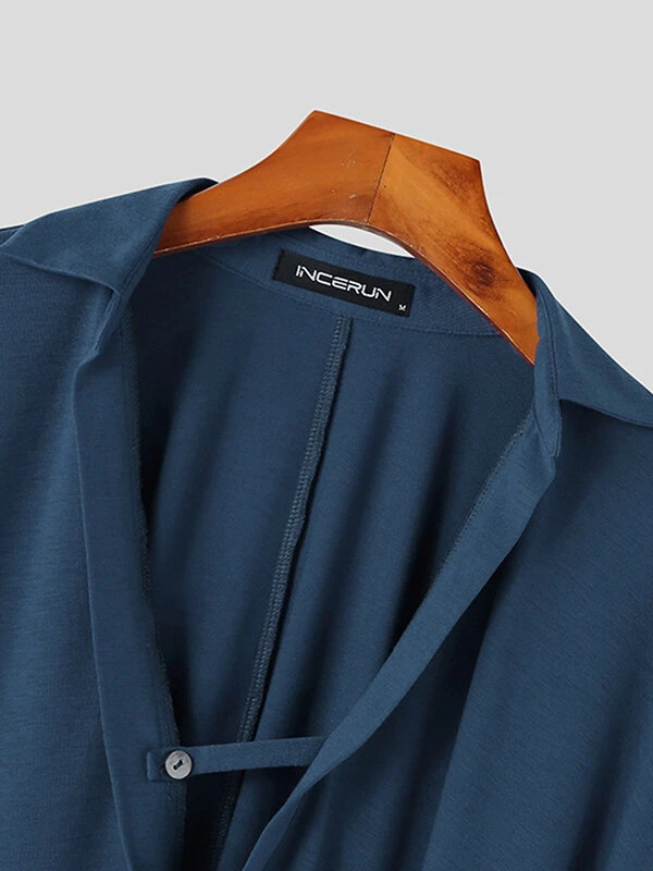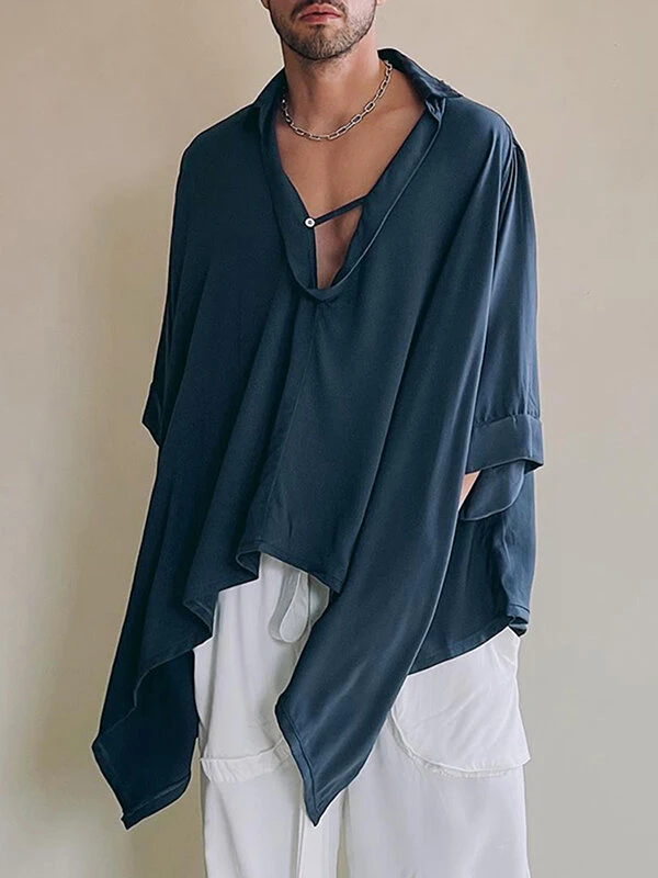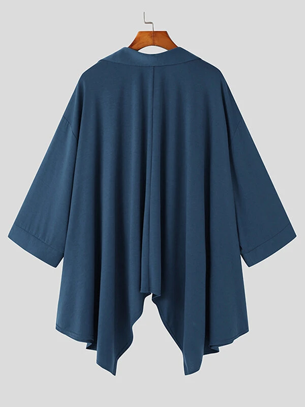 Mens Solid Johnny Collar Irregular Hem 3/4 Sleeve Shirt