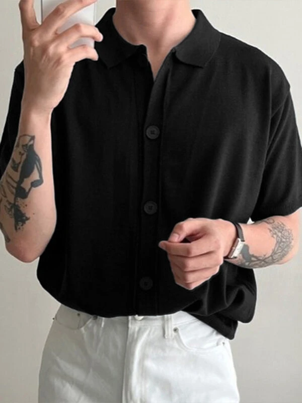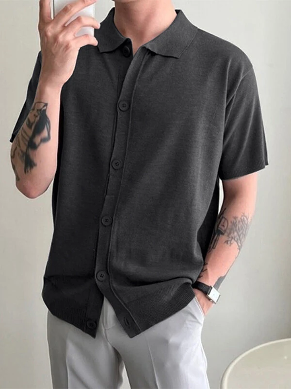 Mens Solid Knit Button Up Short Sleeve Shirt