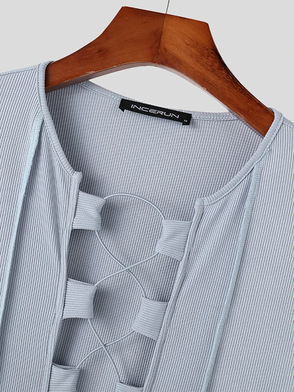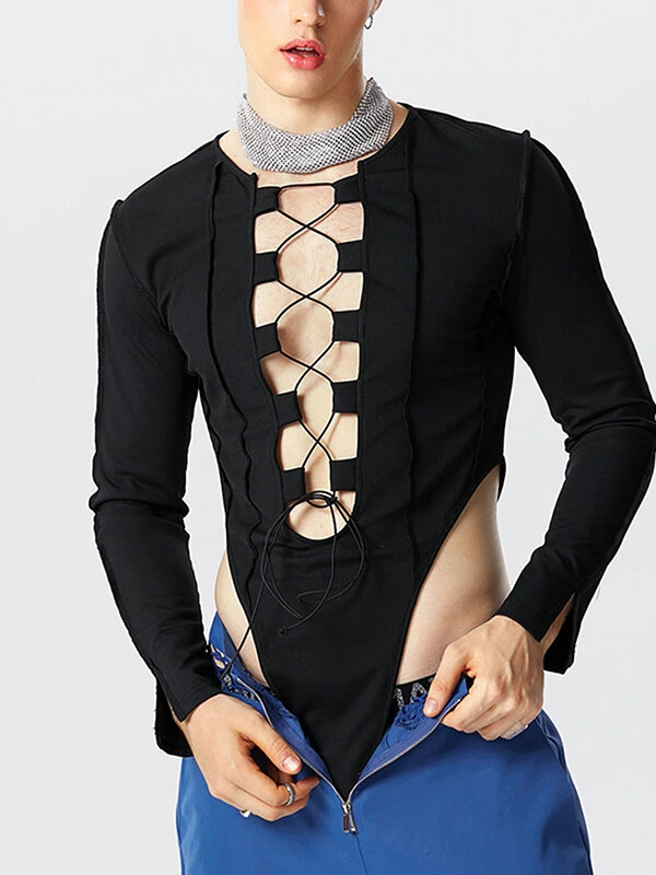 Mens Solid Lace-Up Long Sleeve Bodysuit