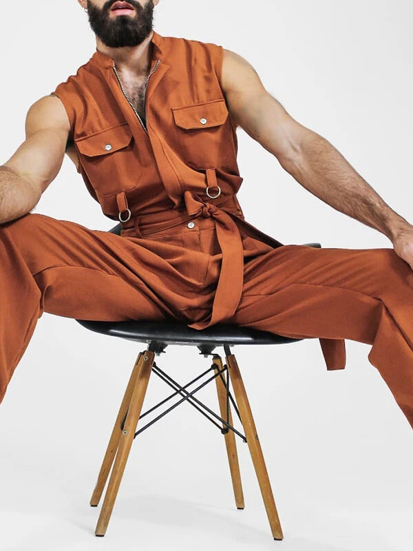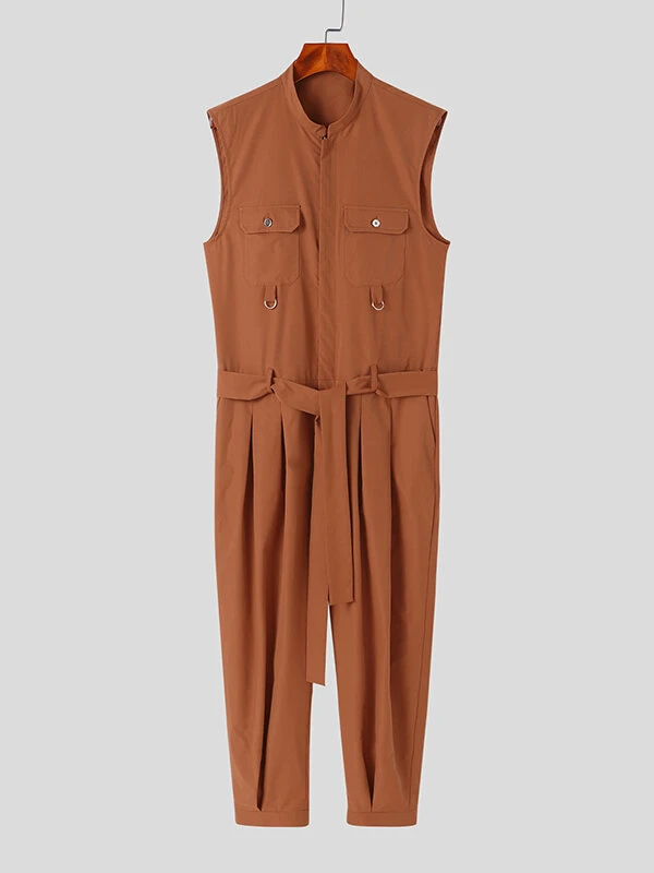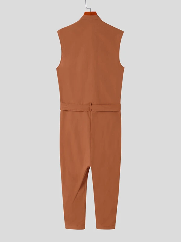 Mens Solid Pleated Flap Pocket Sleeveless Belted Jumpsuit
