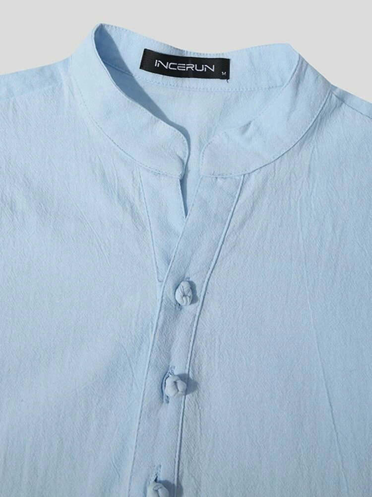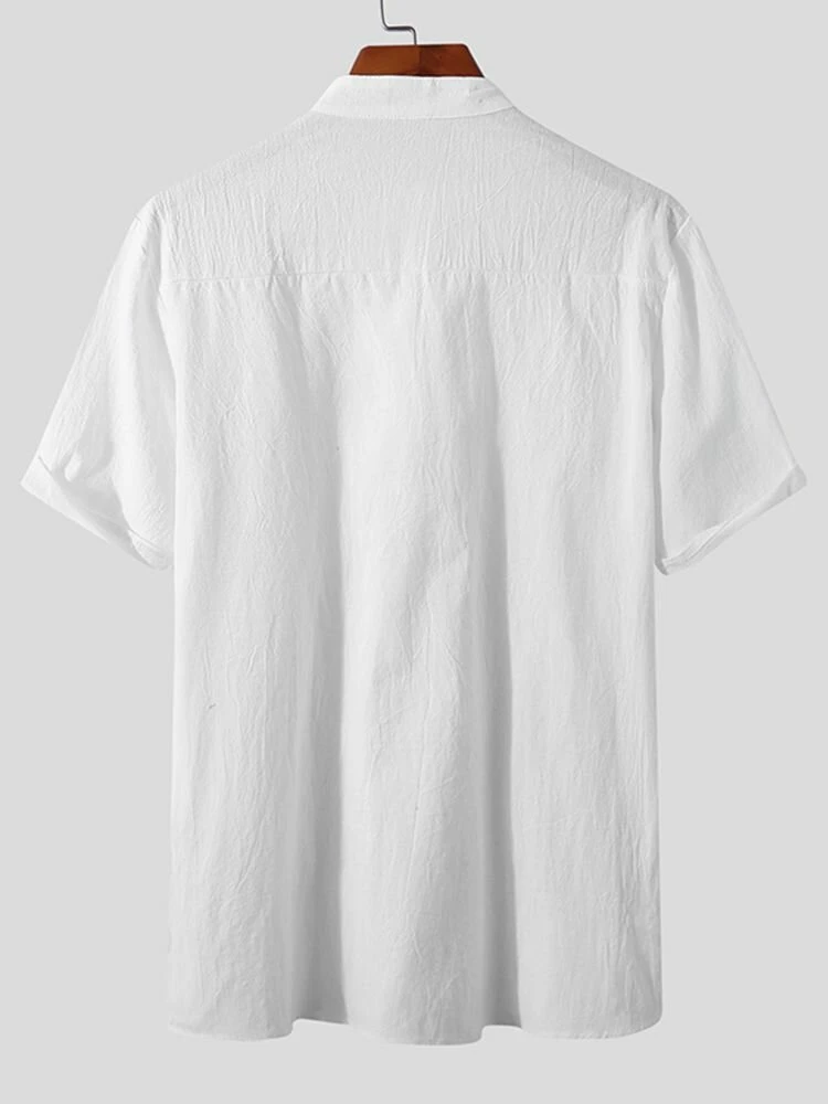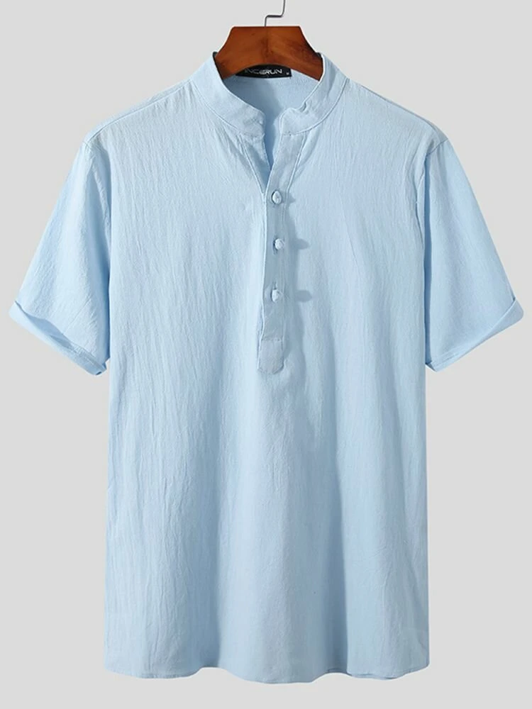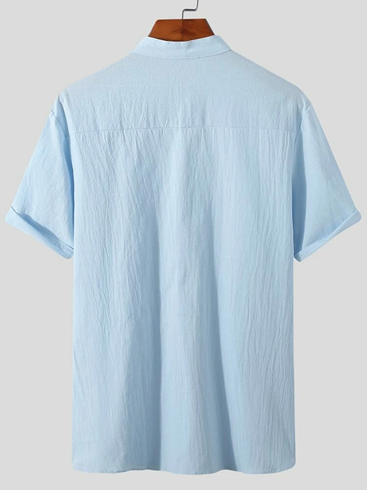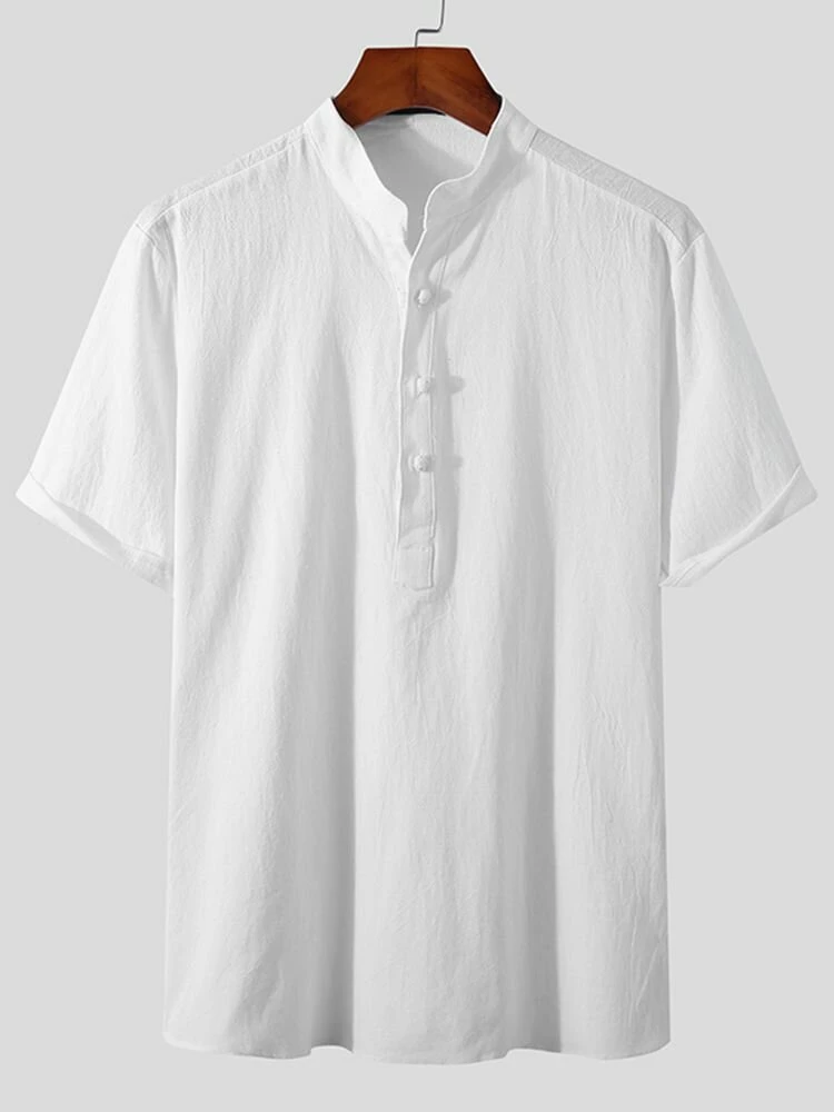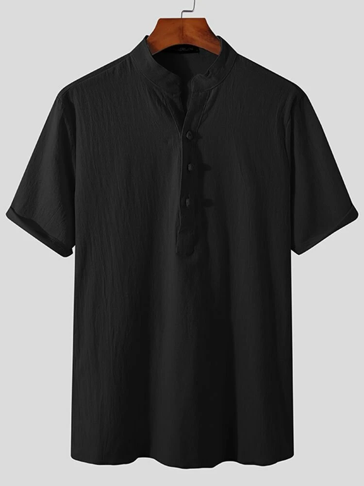 Occasion: Casual Color: Black, White, Blue Size: S, M, L, XL, 2XL, 3XL, 4XL, 5XL Pattern: Solid Collar: Stand Collar Material: Cotton Sleeves Length: Short Sleeve Thickness: Moderate Season: Summer Design Element: Button Package Included:1*Shirt