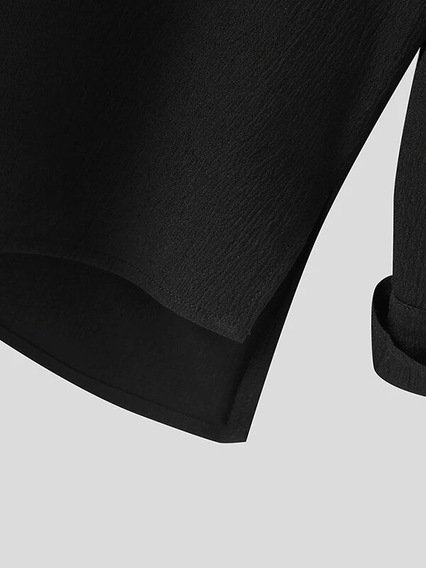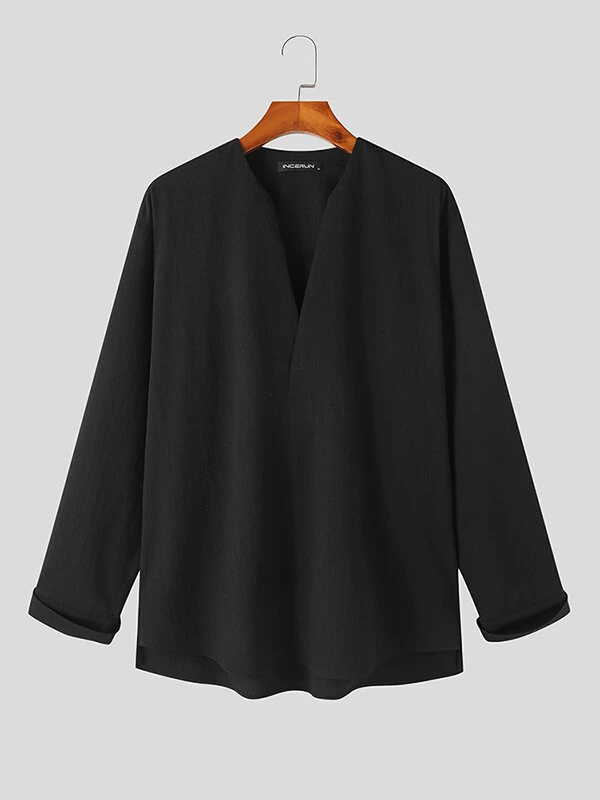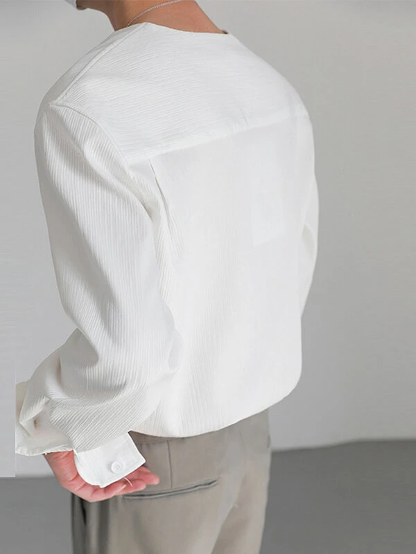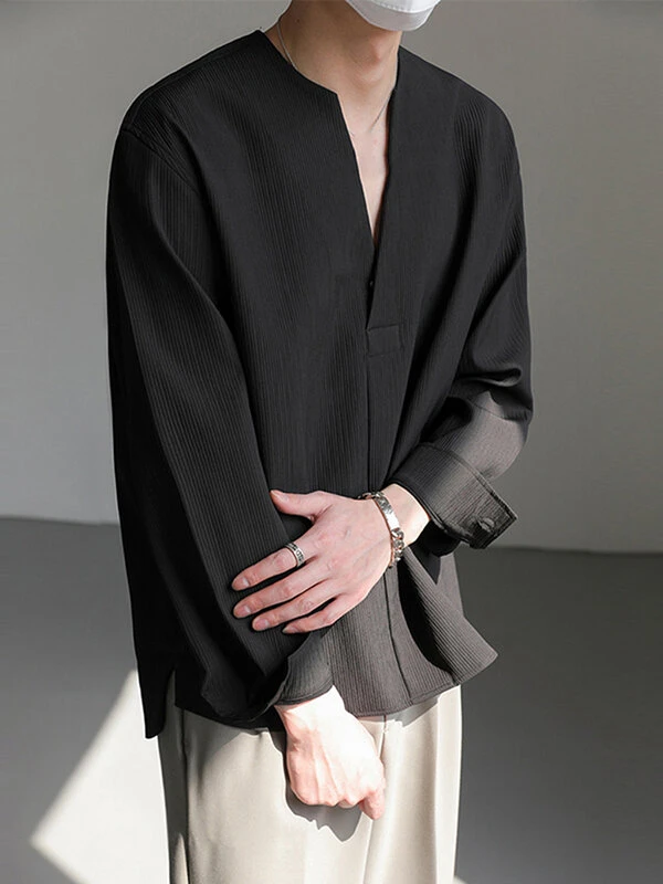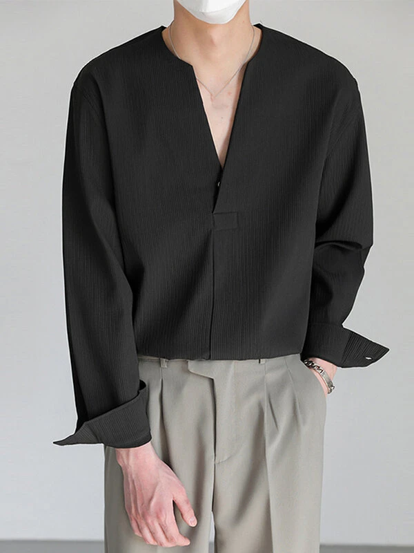 Mens Solid Texture Notched Neck Long Sleeve Shirt