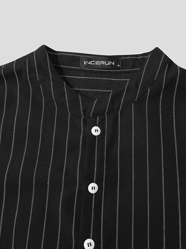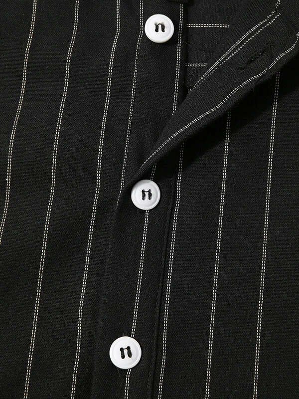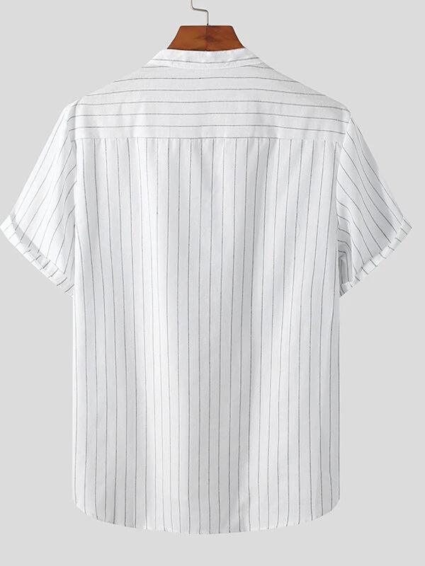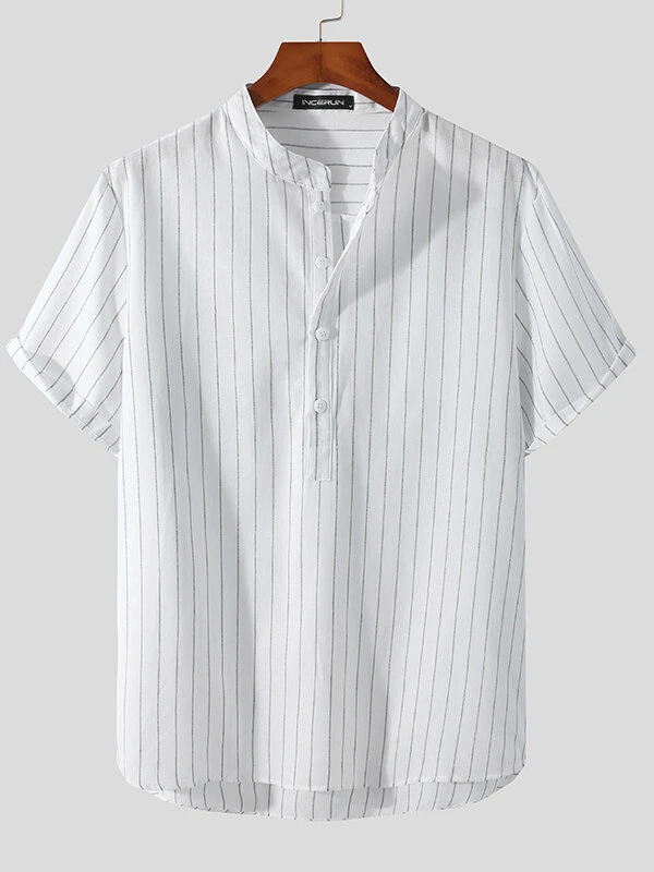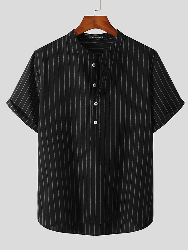 Occasion: Casual Color: Black, White Size: S, M, L, XL, 2XL, 3XL, 4XL, 5XL Pattern: Striped Collar: Stand Collar Material: Cotton, Polyester Sleeves Length: Short Sleeve Thickness: Moderate Season: Summer Design Element: Button Package Included:1*Shirt