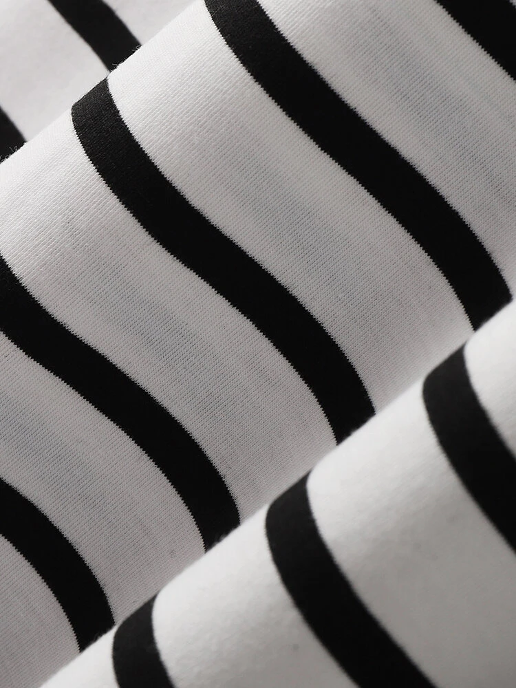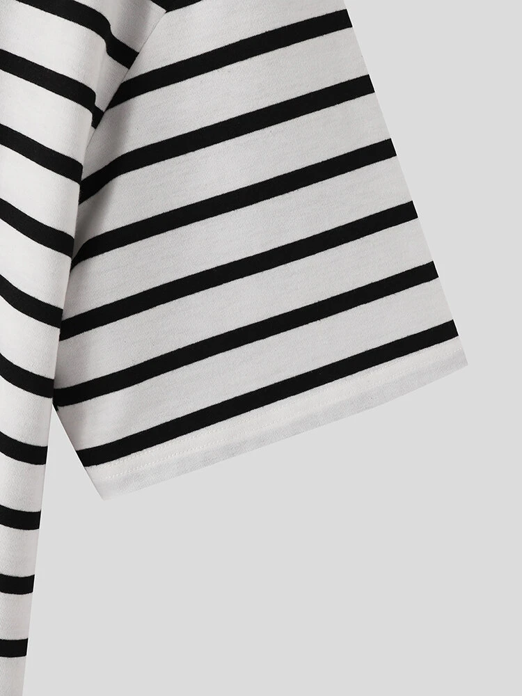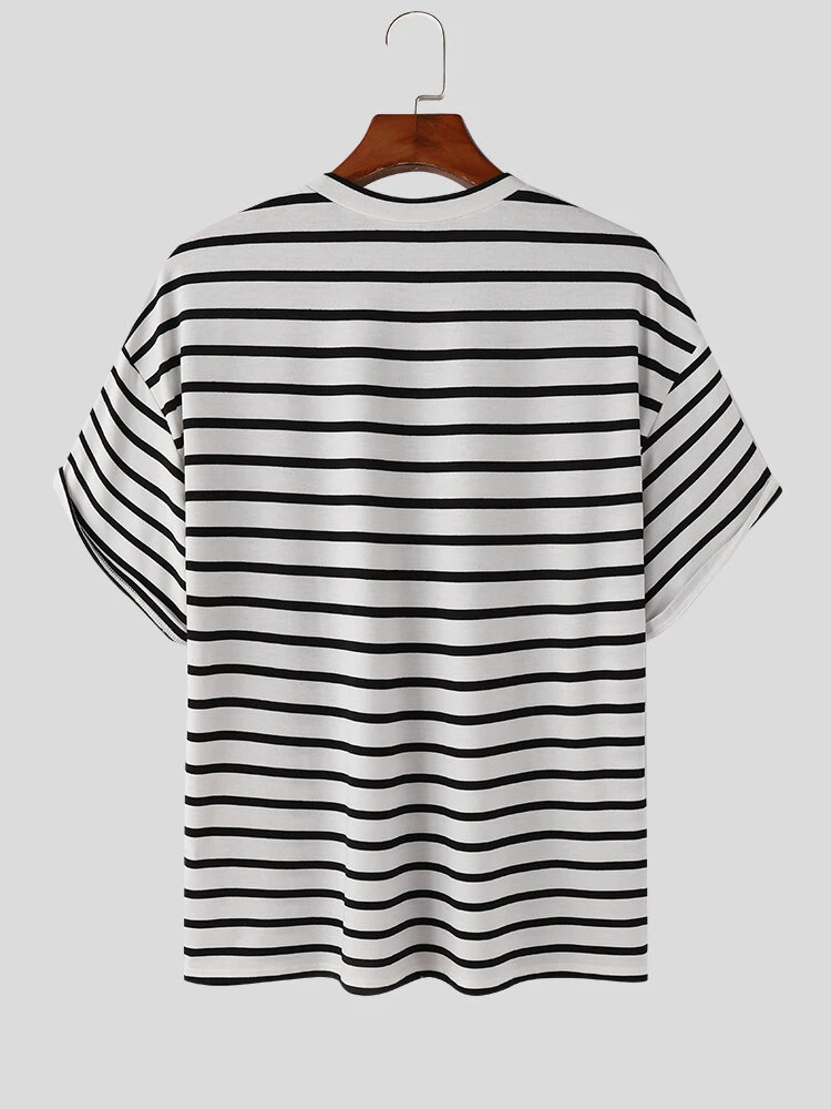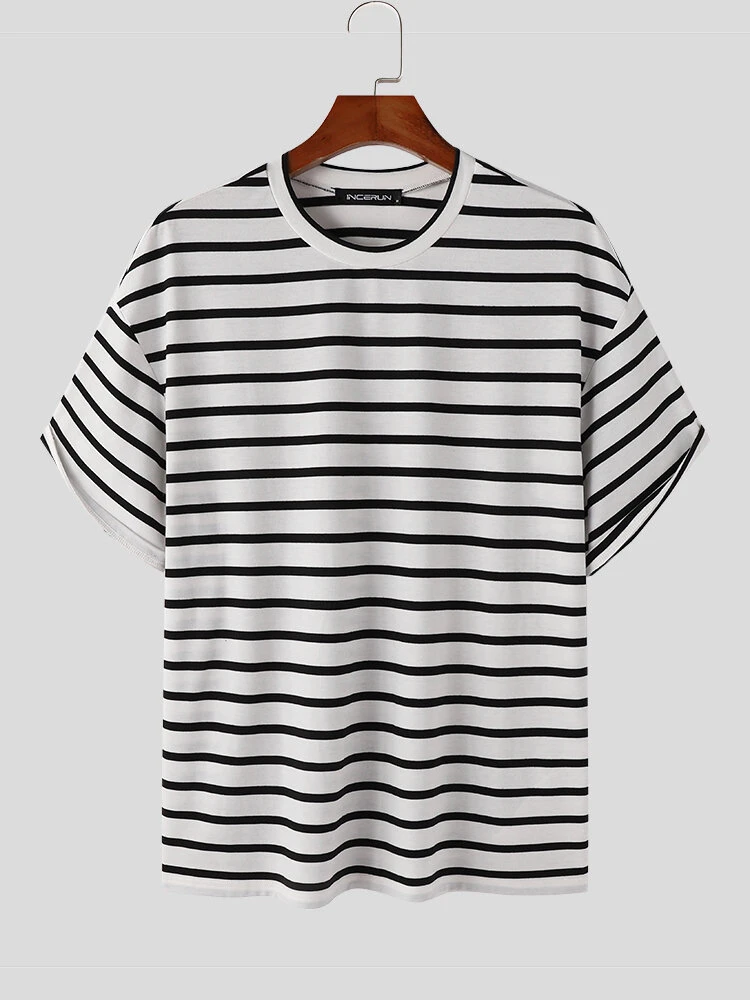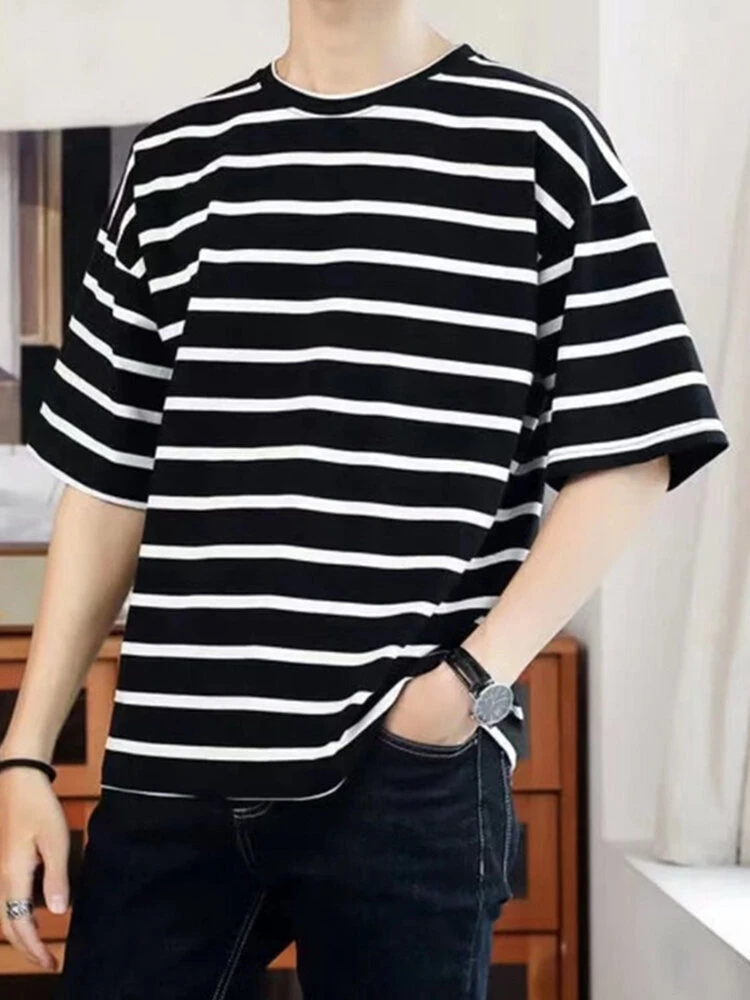 Occasion: Casual Color: Black, White Size: S, M, L, XL, 2XL, 3XL, 4XL, 5XL Pattern: Striped Collar: Crew Neck Material: Spandex, Polyester Sleeves Length: Short Sleeve Thickness: Moderate Season: Summer Fit Type: Regular Package included:1*T-ShirtPlease Note:Please see the Size Reference to find the correct size.