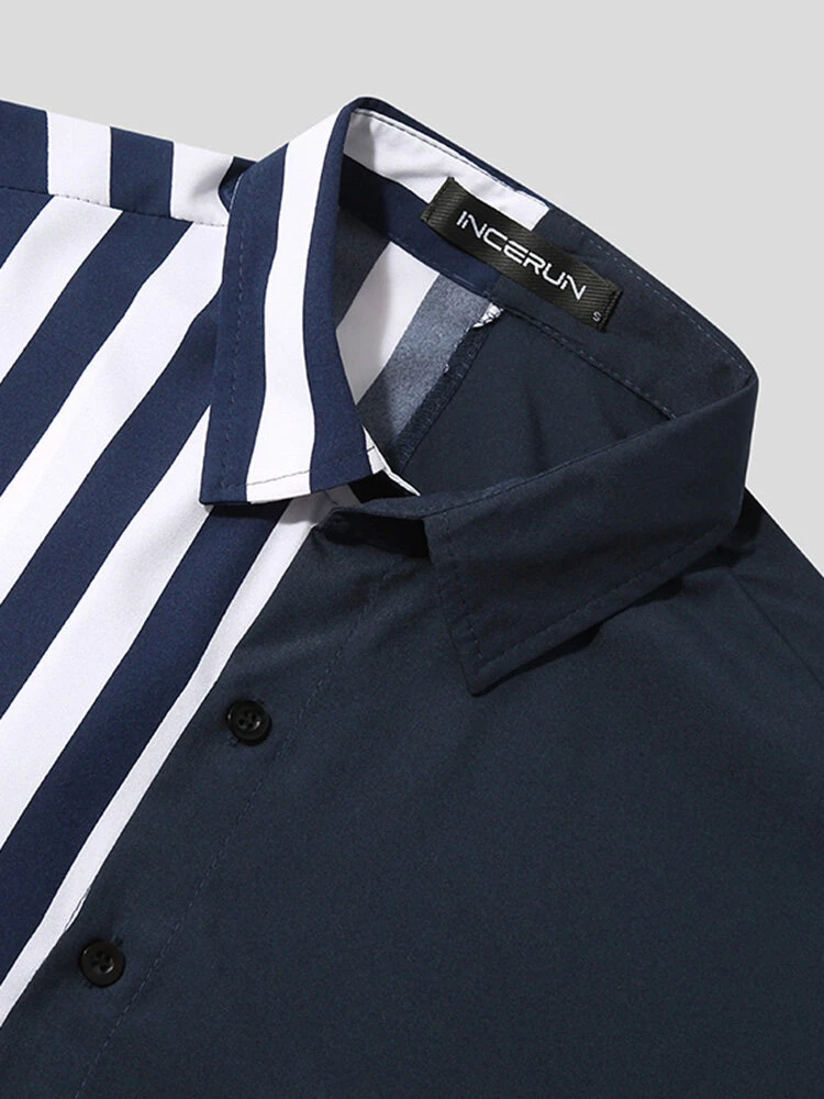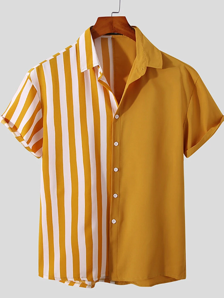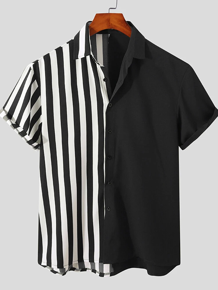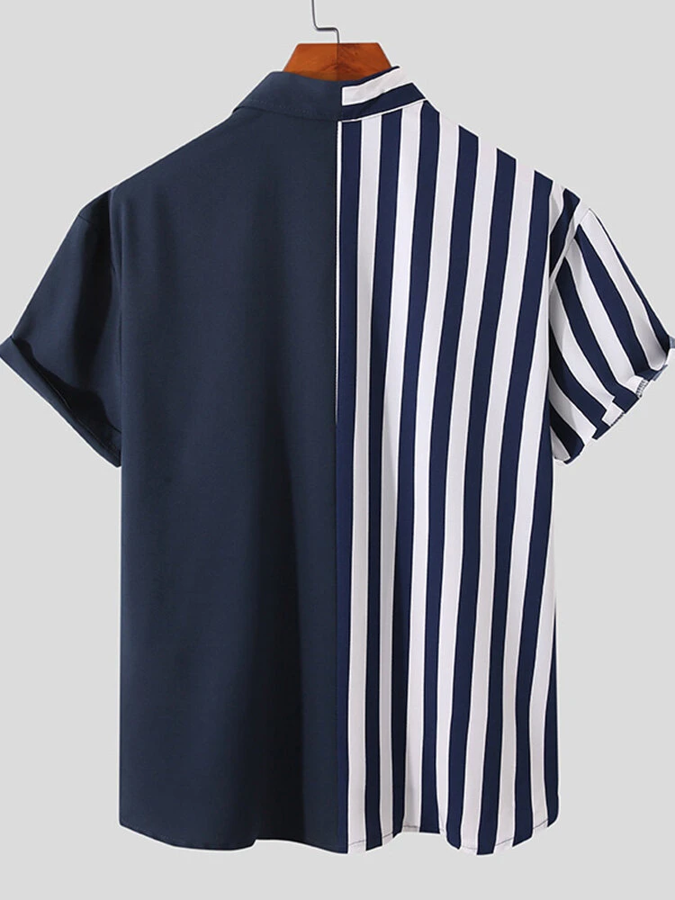 Mens Striped Pattern Patchwork Button Short Sleeve Shirt