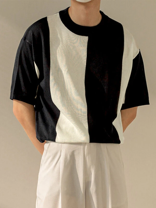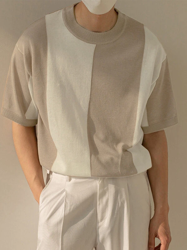 Mens Two Tone Colorblock Knitted Pullover T-Shirt