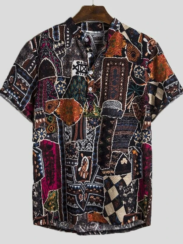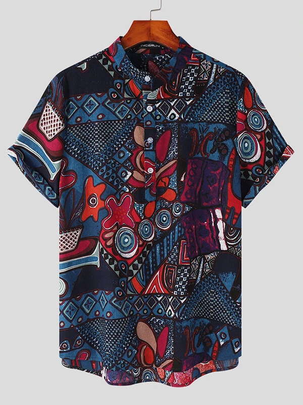 Color: Navy, Brown, Yellow Occasion: Ethnic Size: S, M, L, XL, 2XL, 3XL, 4XL, 5XL Pattern: Plants, Geometric Pattern Collar: Stand Collar Material: Cotton Sleeves Length: Short Sleeve Thickness: Moderate Season: Summer Design Element: Button, Print Fit Type: Regular Package included:1*Henley ShirtPlease Note:Please see the Size Reference to find the correct size.