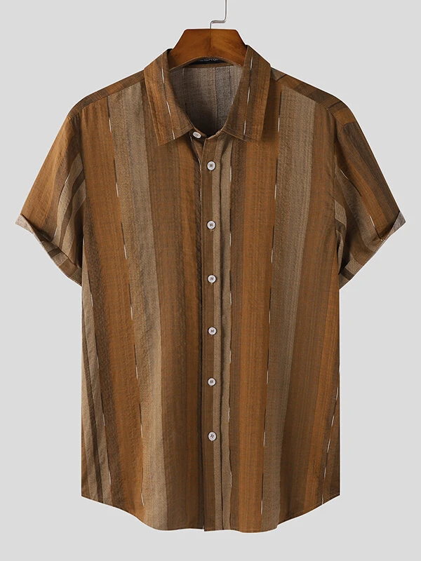 Color: Khaki, Navy Occasion: Daily Size: S, M, L, XL, 2XL, 3XL, 4XL, 5XL Pattern: Striped Collar: Lapel Collar Material: Rayon, Cotton Sleeves Length: Short Sleeve Thickness: Moderate Season: Summer Design Element: Button Fit Type: Regular Package included:1*ShirtPlease Note:Please see the Size Reference to find the correct size.