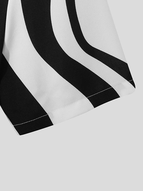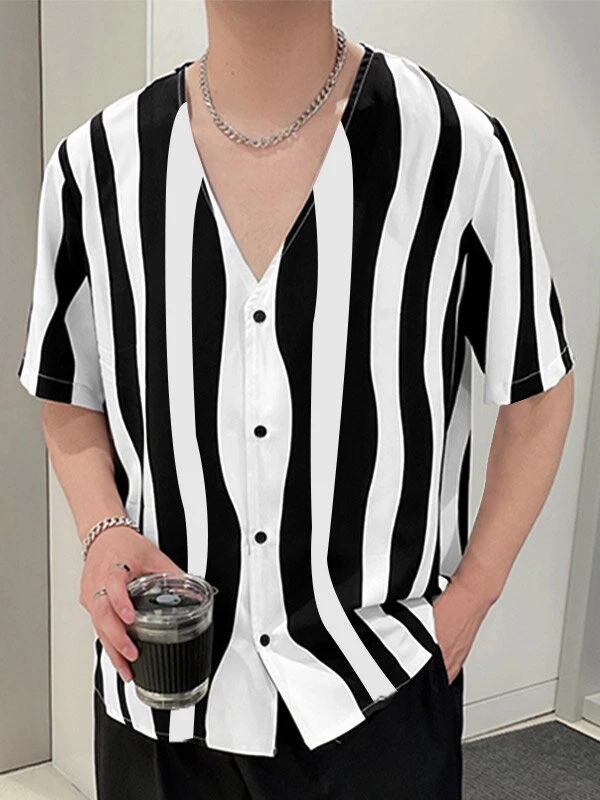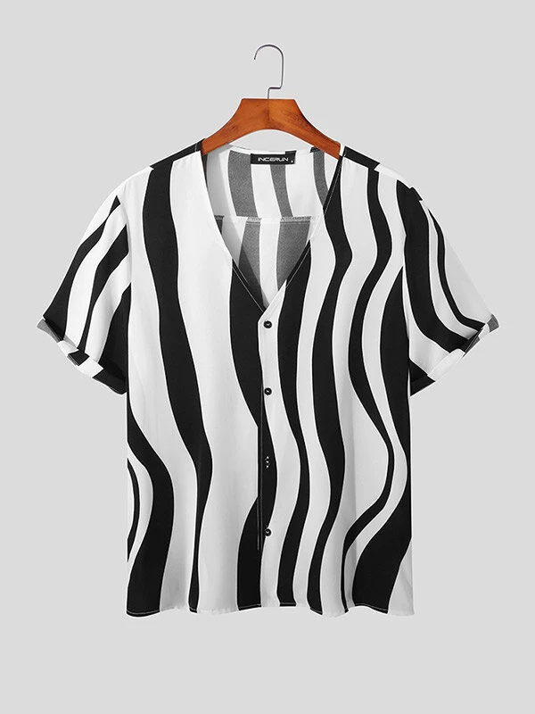 Mens Wave Striped V-Neck Casual Short Sleeve Shirt